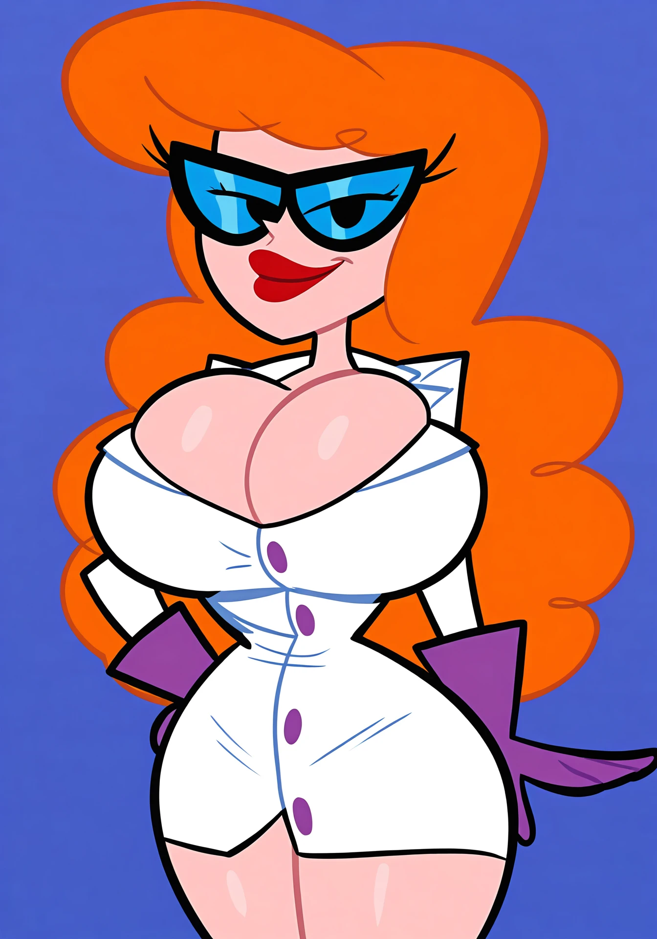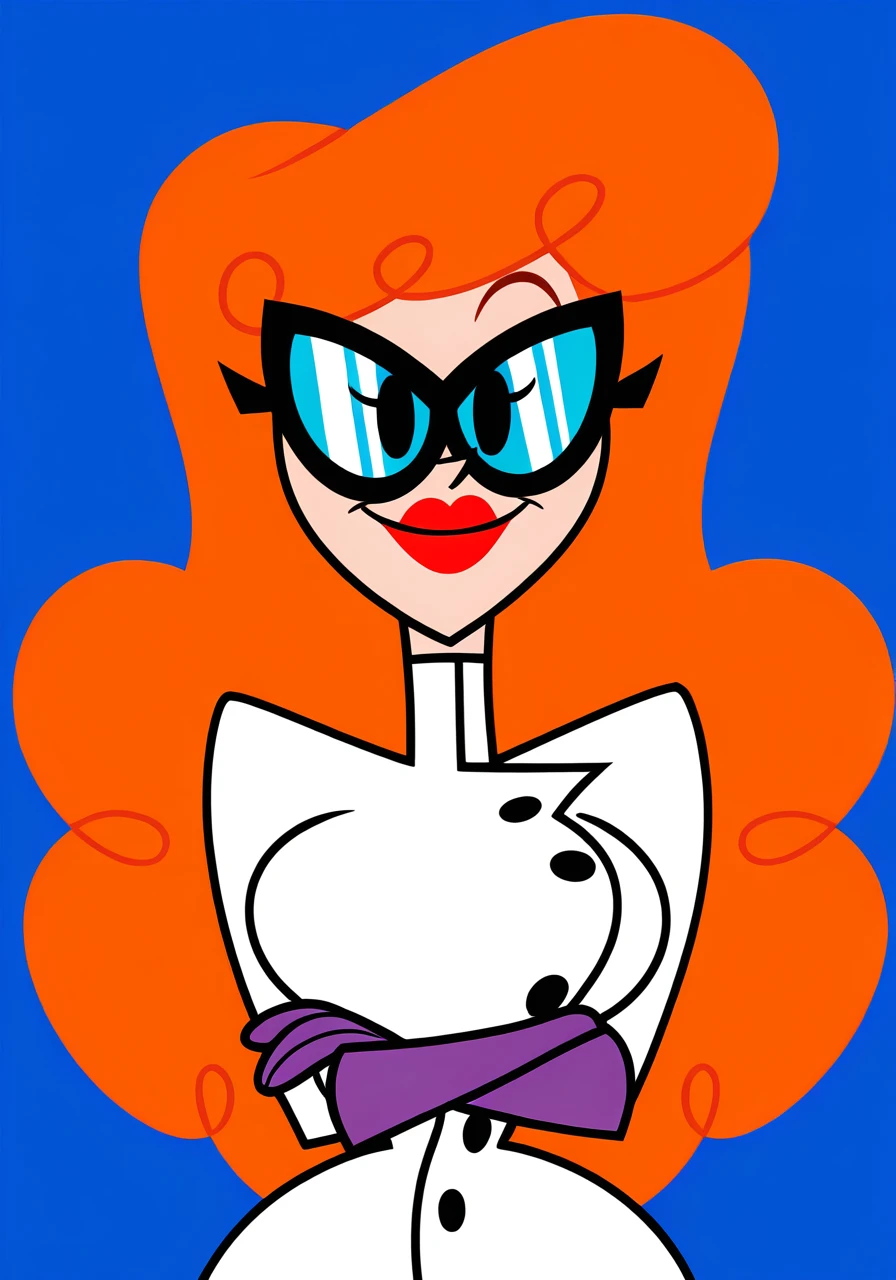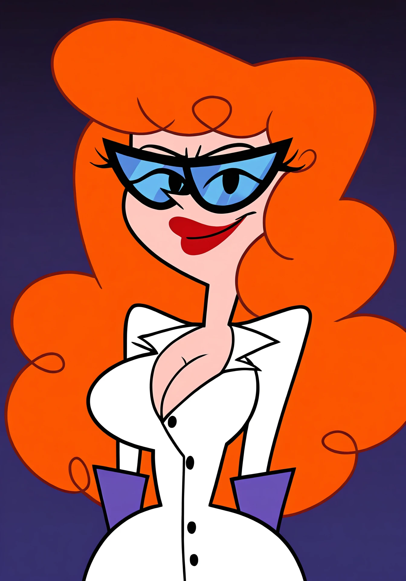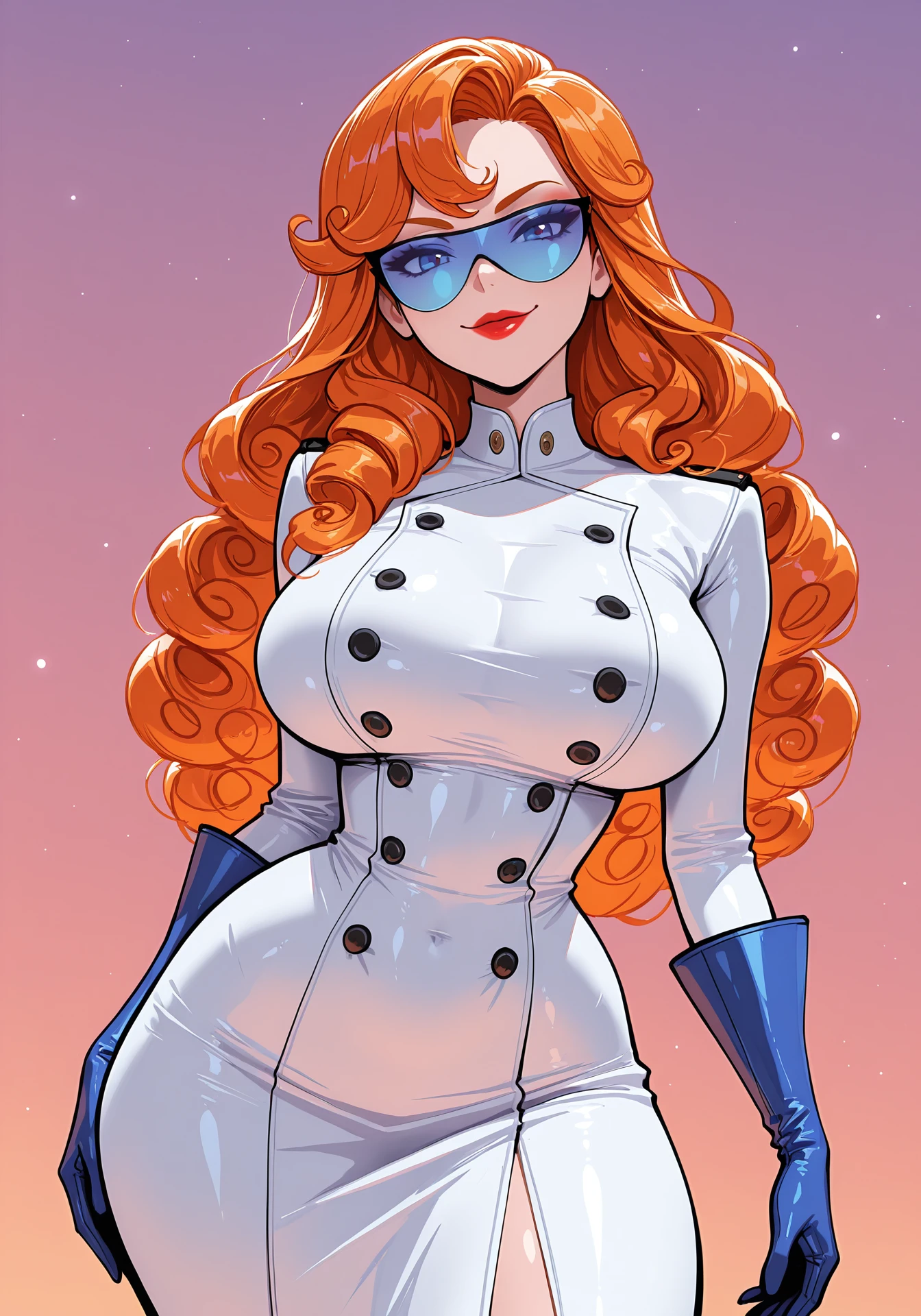 femaledexter, orange hair, black eyes, red lips, lipstick, curly hair, blue-tinted eyewear