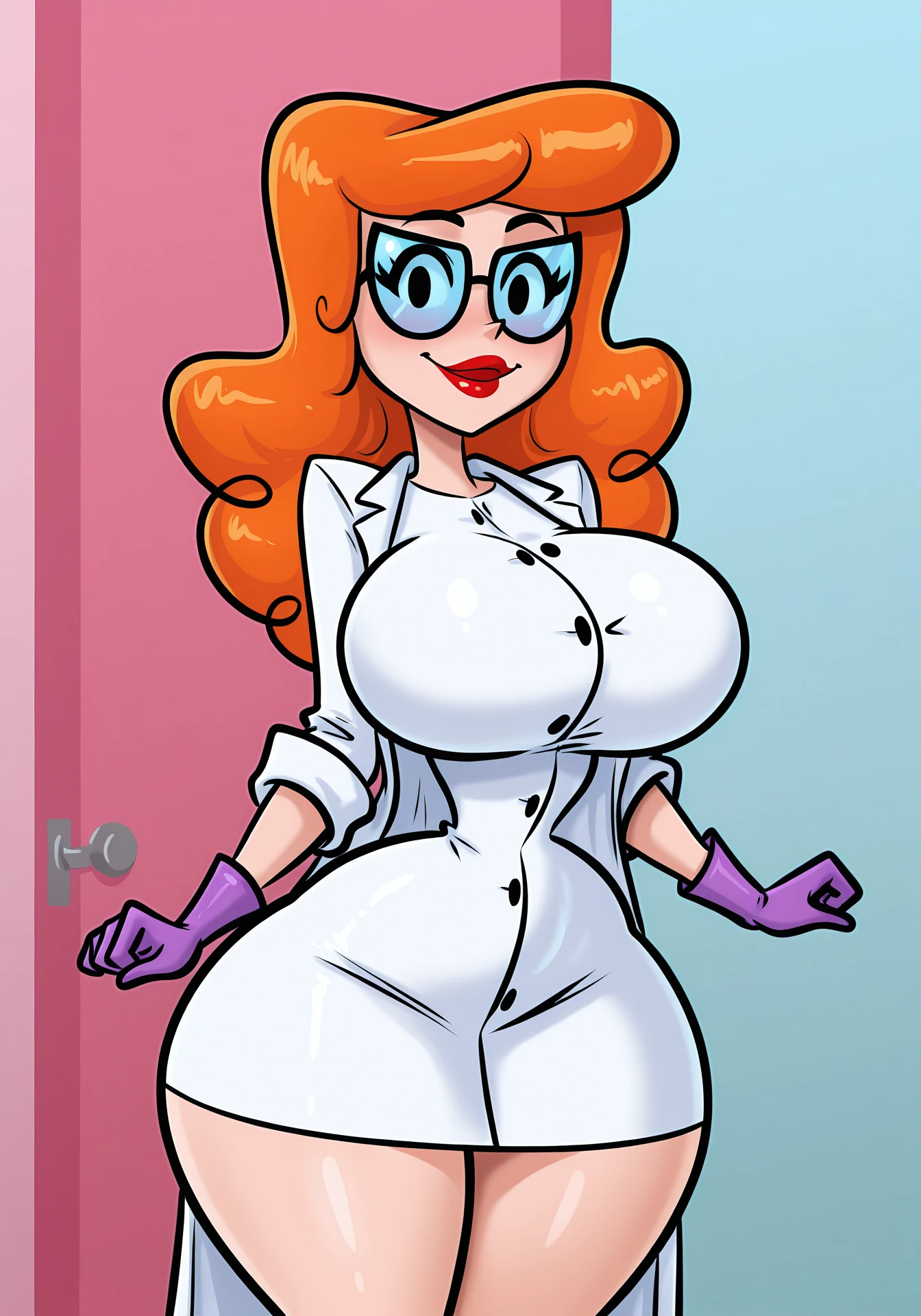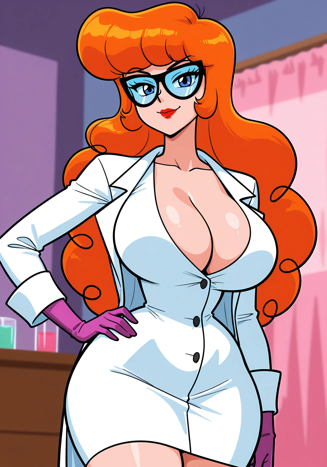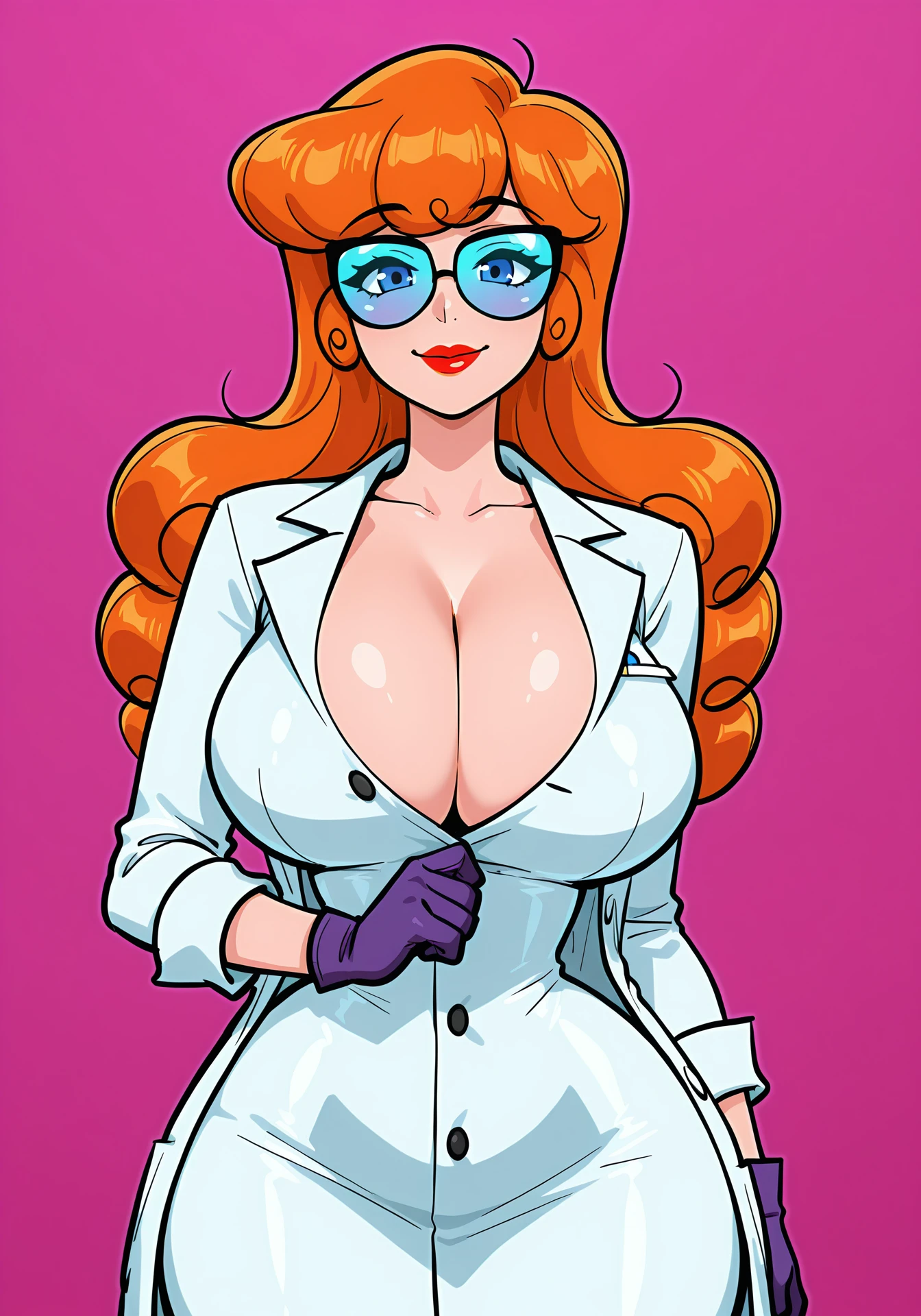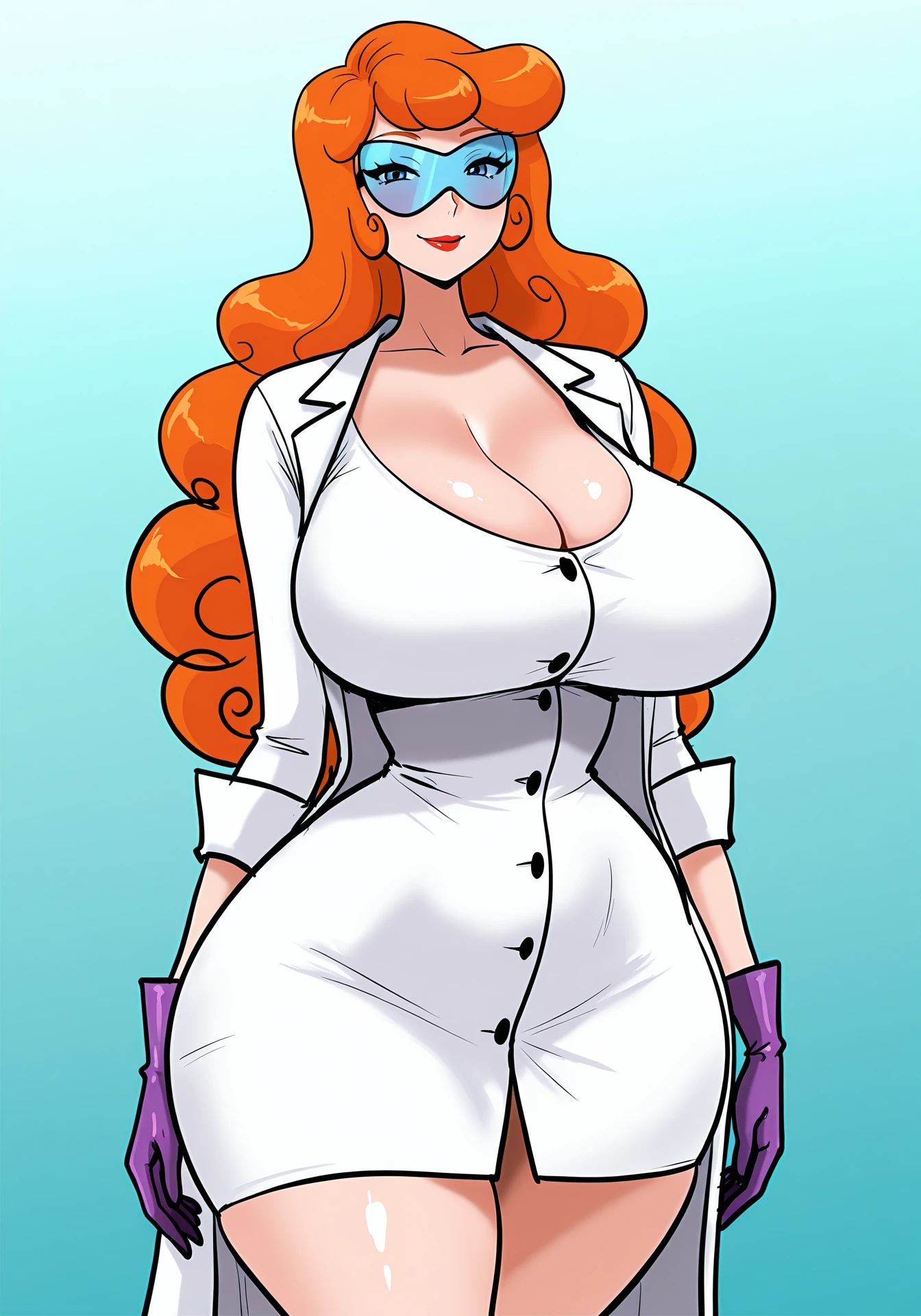 femaledexter, orange hair, black eyes, red lips, lipstick, curly hair, blue-tinted eyewear