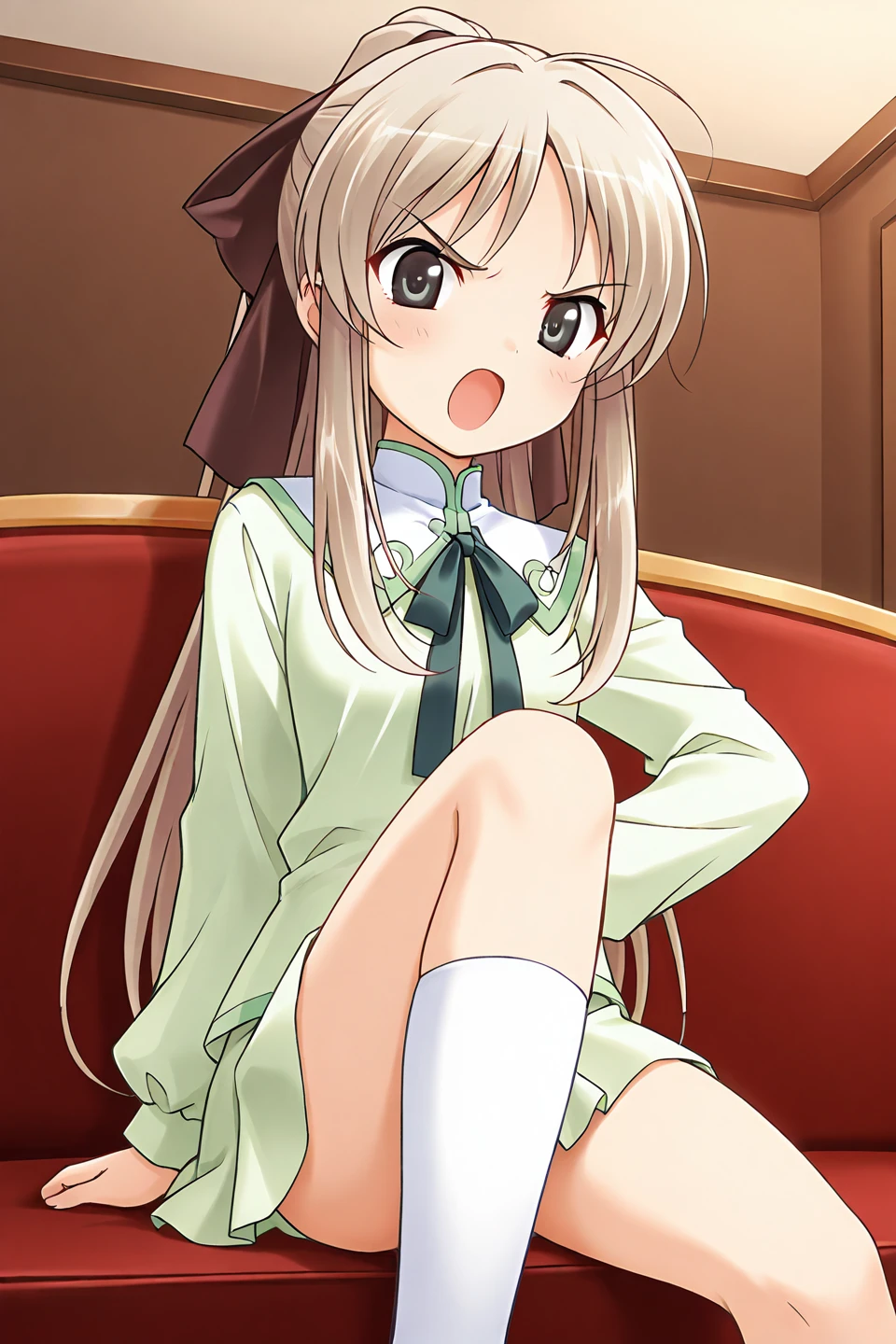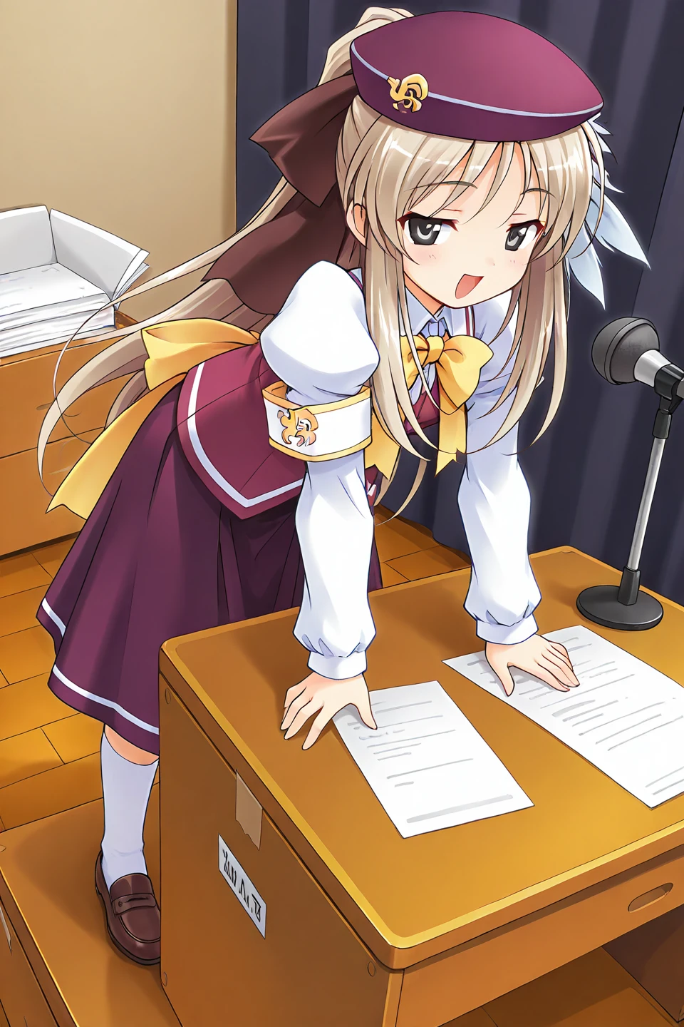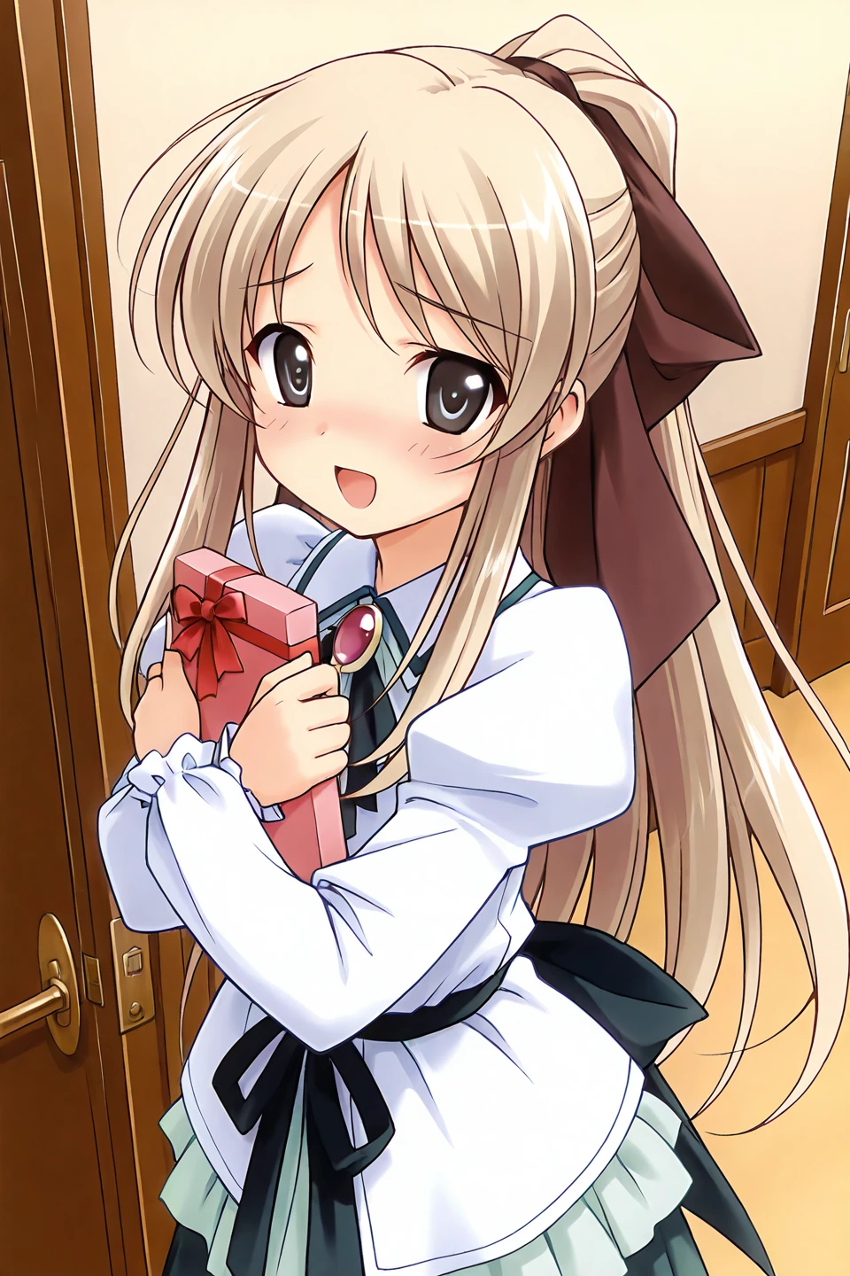 kazamatsuri miyabi, black eyes, grey eyes, blonde hair, brown hair, very long hair, sidelocks, ponytail, ribbon, hair ribbon, black ribbon,