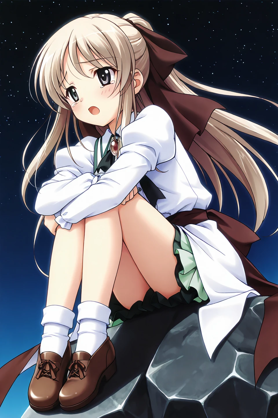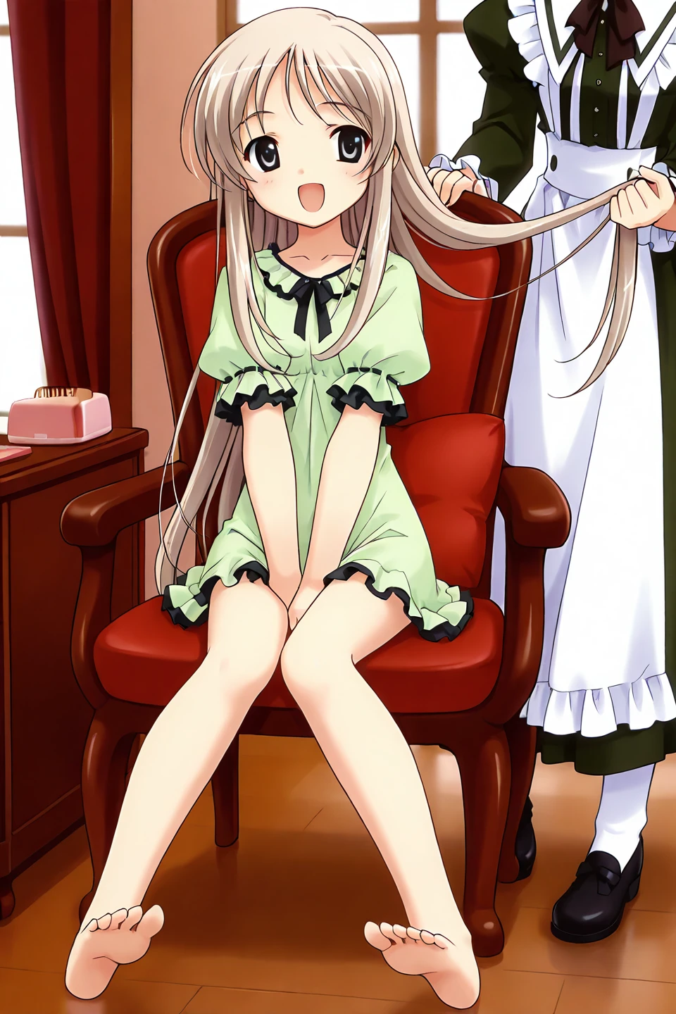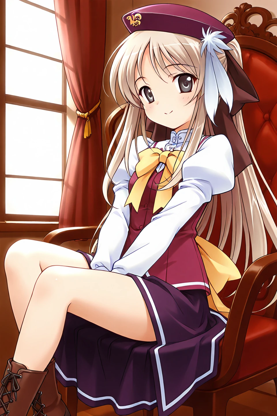 kazamatsuri miyabi, black eyes, grey eyes, blonde hair, brown hair, very long hair, sidelocks, ponytail, ribbon, hair ribbon, black ribbon,