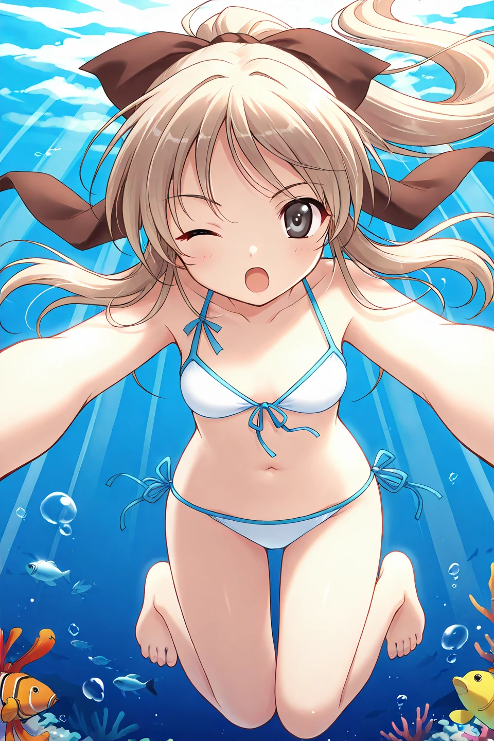 swimsuit,frills,frilled bikini,blue bikini,bow,navel,メイド服 (maid) ※特典絵