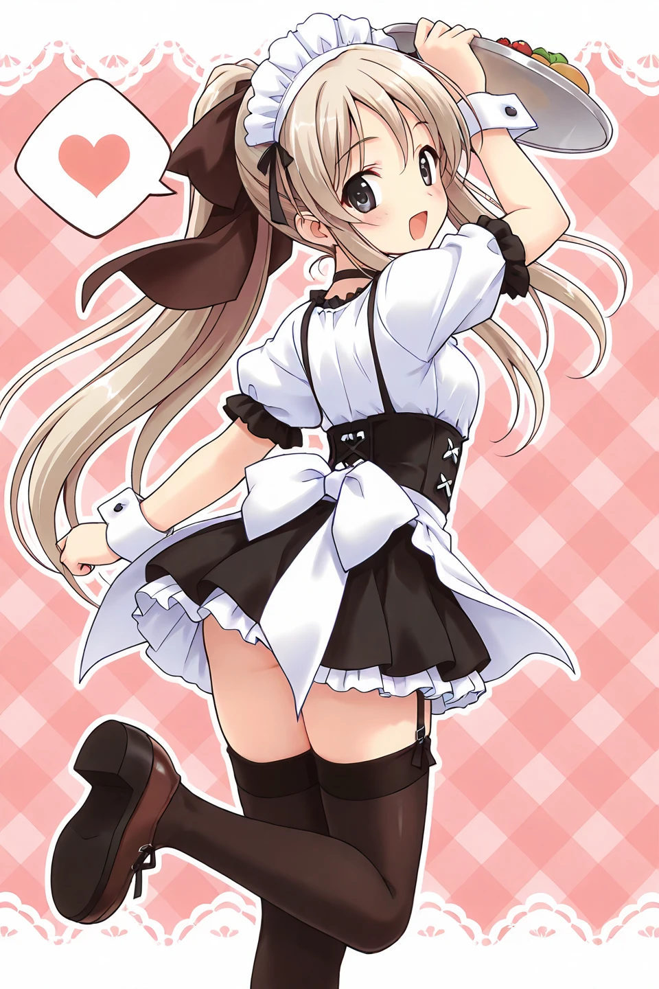 maid, maid headdress, choker, white shirt, short sleeves, wrist cuffs, corset, white bow, back bow, waist apron, white apron, black skirt, garter straps, black thighhighs, zettai ryouiki, boots,