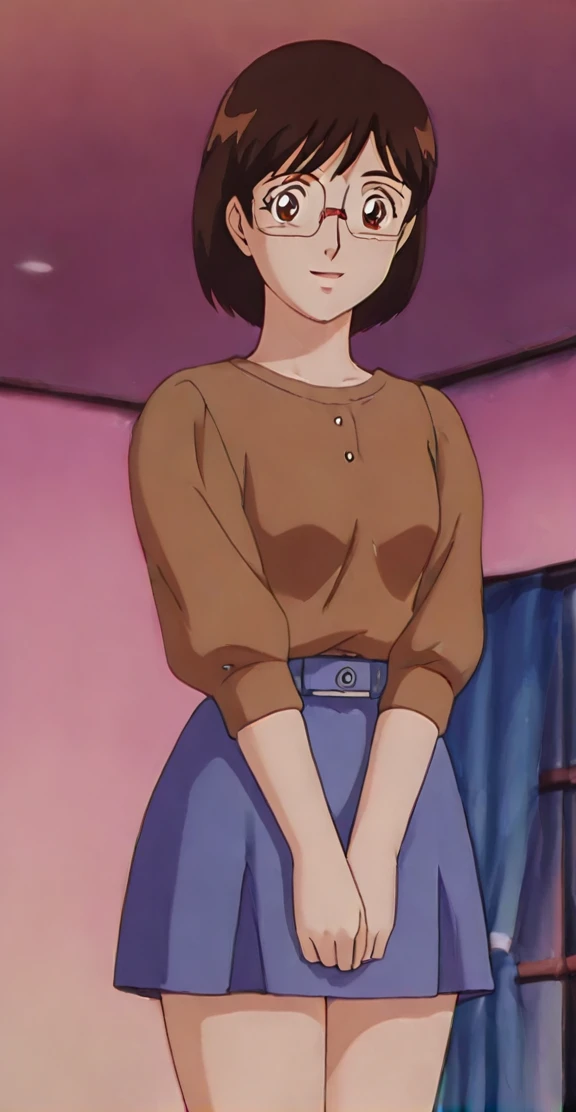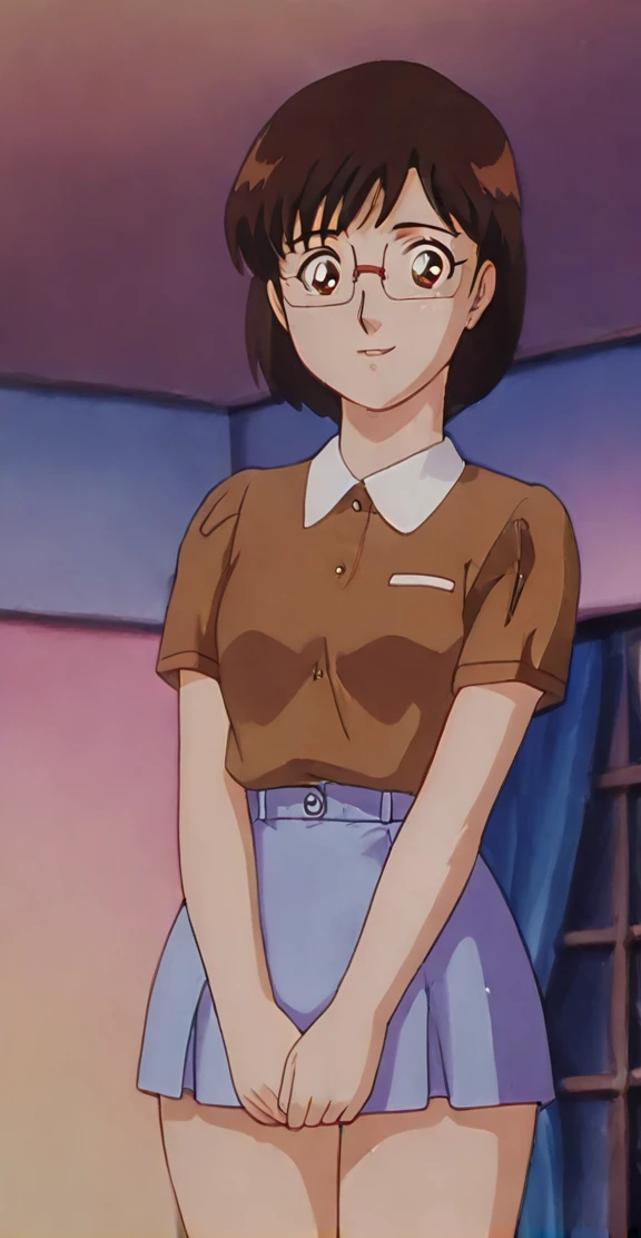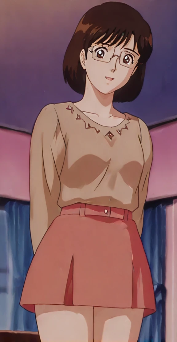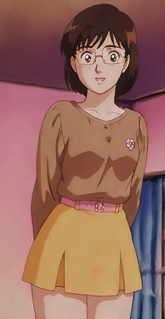 anime screencap,anime coloring <lora:Suzumori Emi - Kindaichi Sonen no Jikenbo v4:0.9> Suzumori Emi, 1girl, solo, smile, short hair, open mouth, black hair, brown eyes, glasses, retro artstyle,