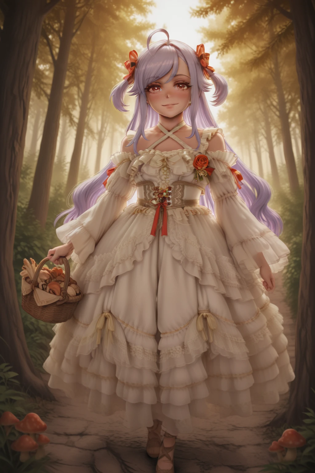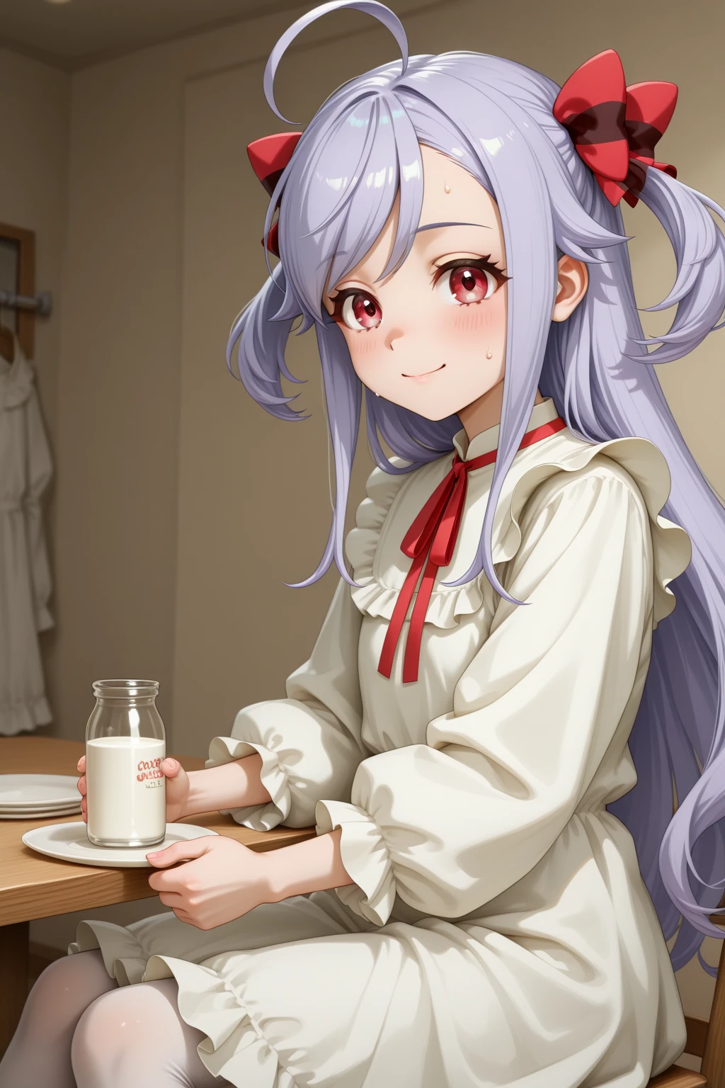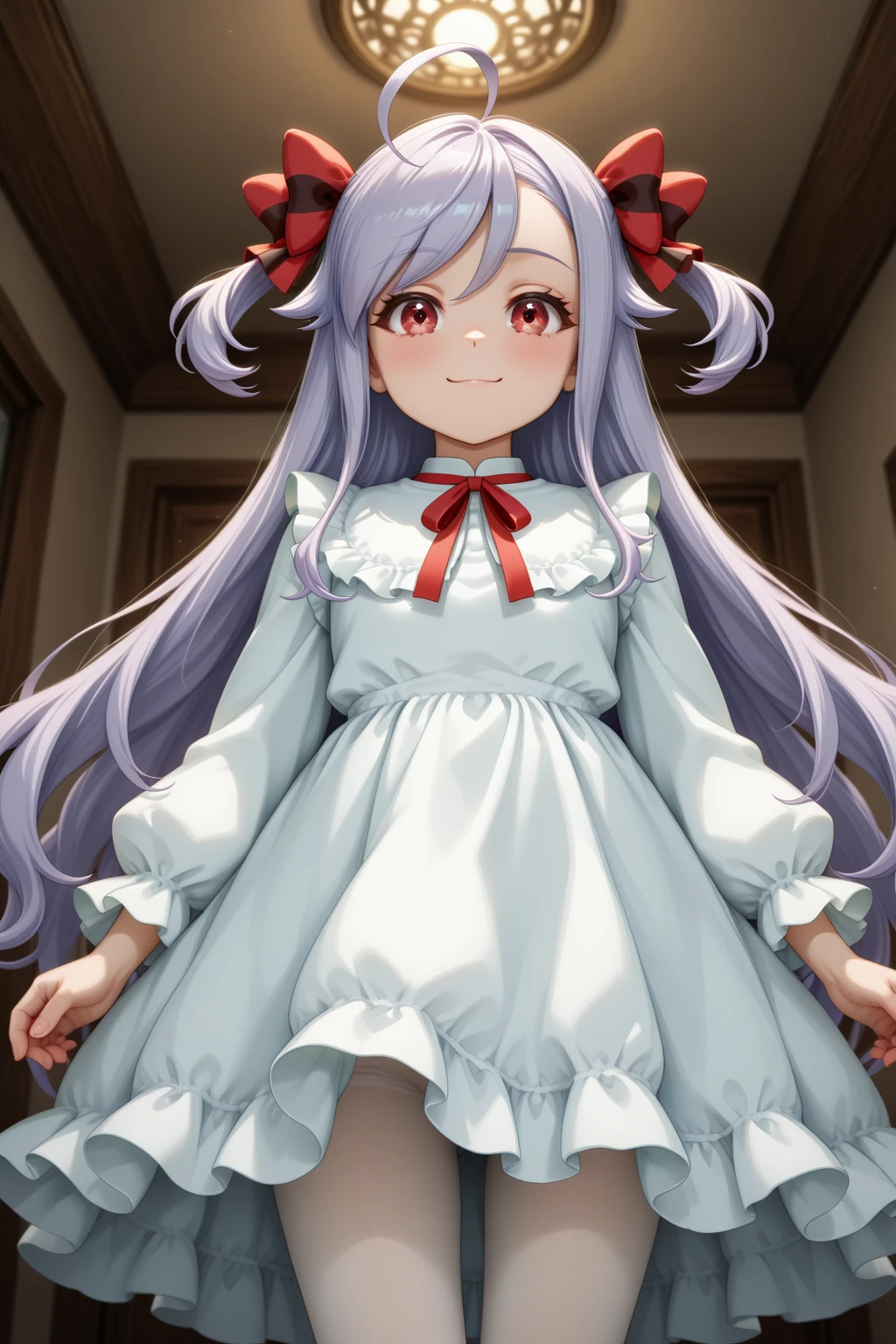 dress, white dress, frilled dress, neck ribbon, long sleeves, puffy sleeves, white pantyhoseDescription