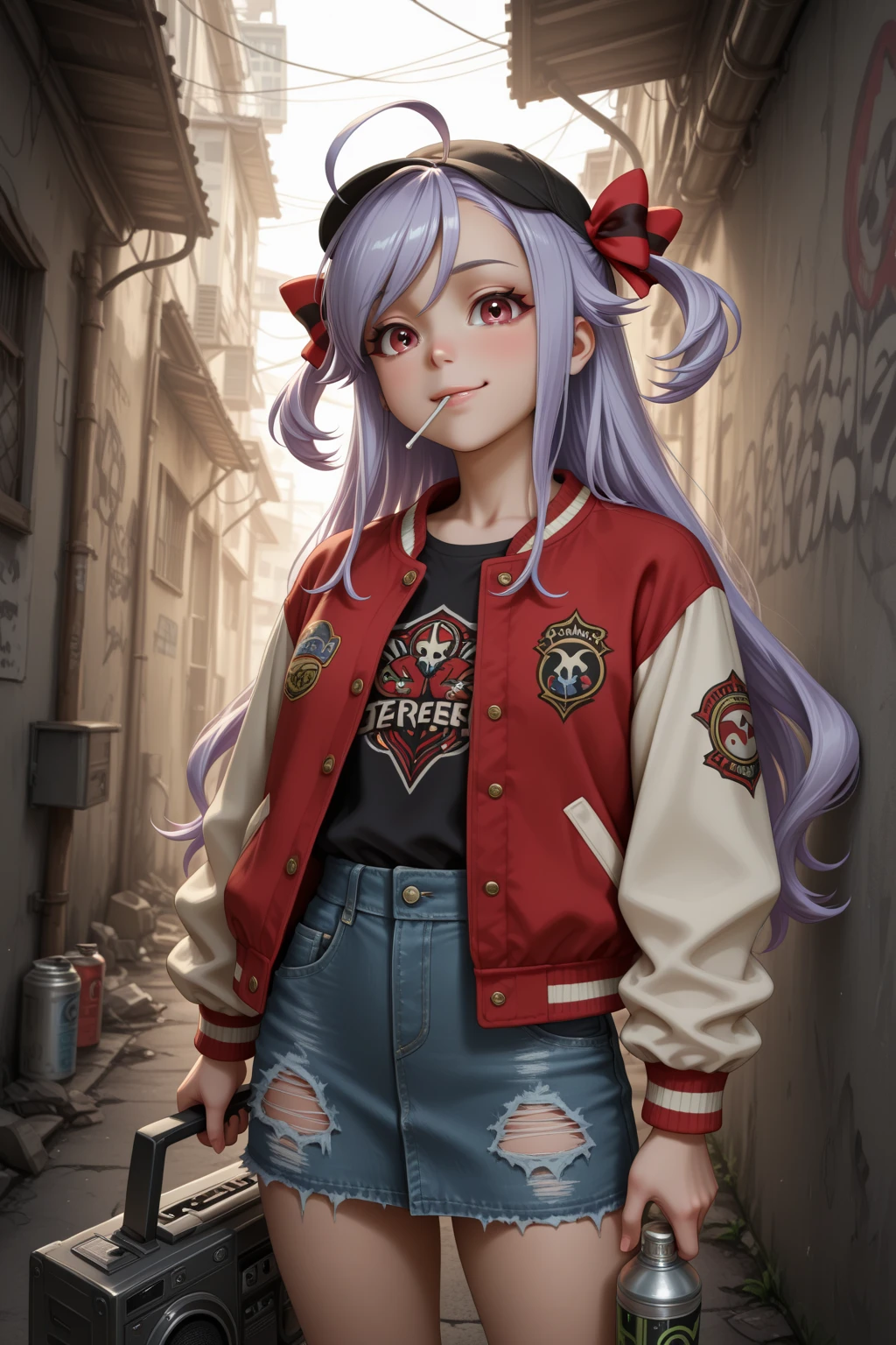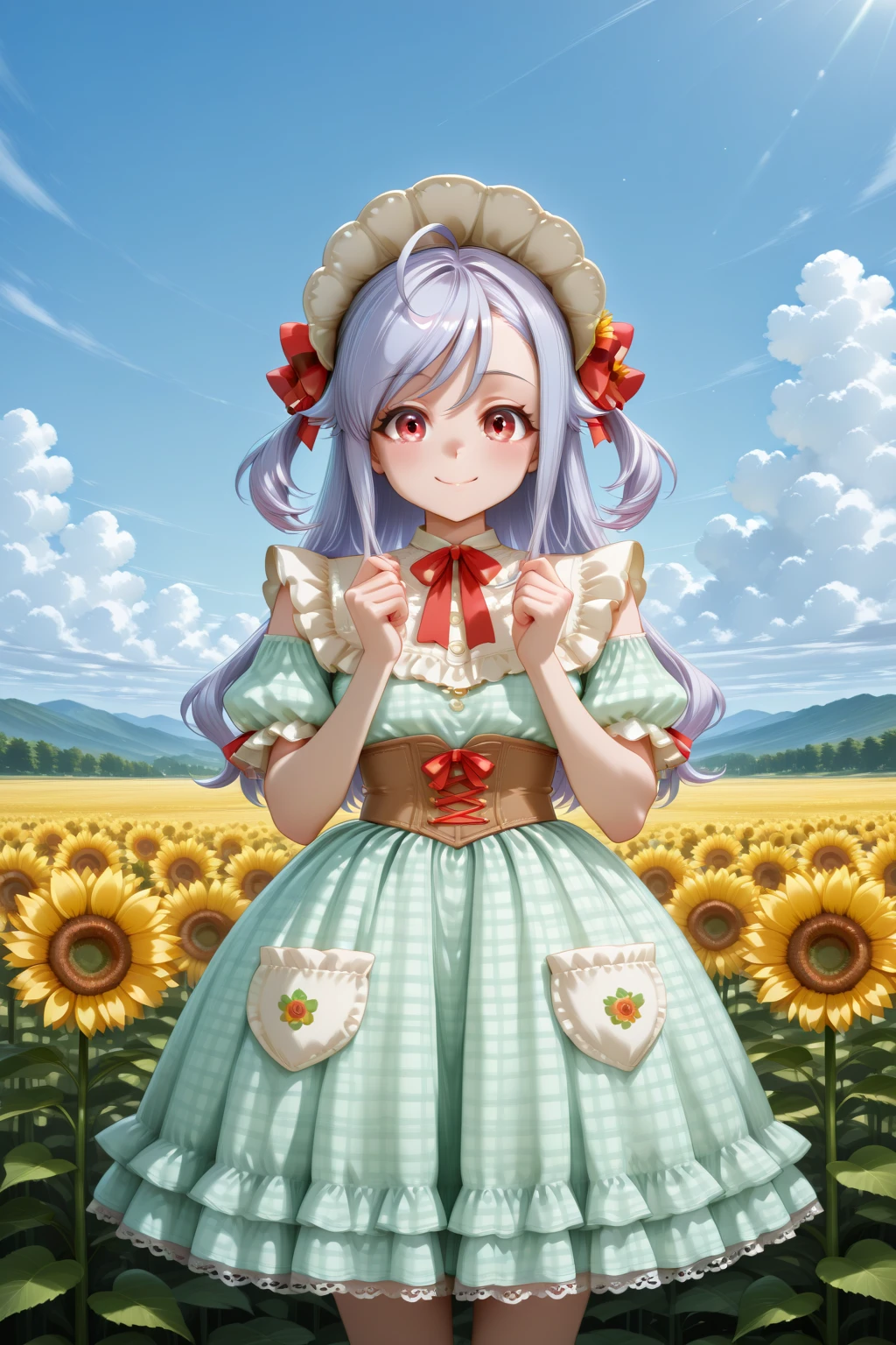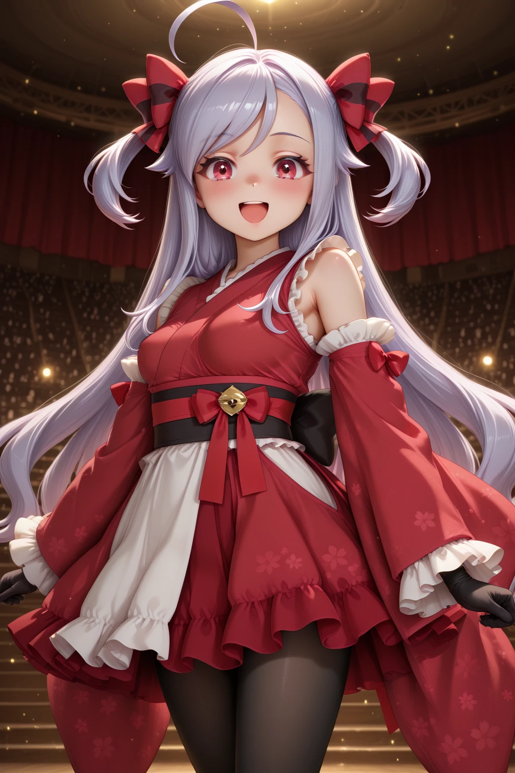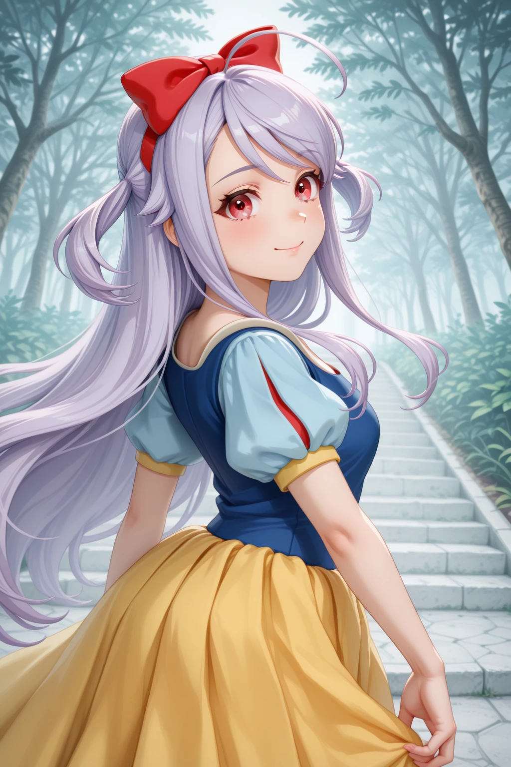 Niizuma_Yae_SIRIUS, long hair, red eyes, hair bow, red ribbon, purple hair, two side up, ahoge, sidelocks, swept bangsoutfit