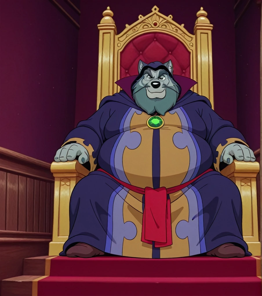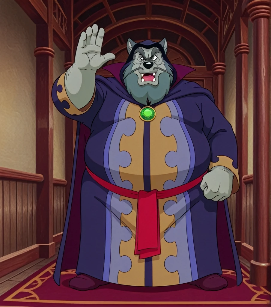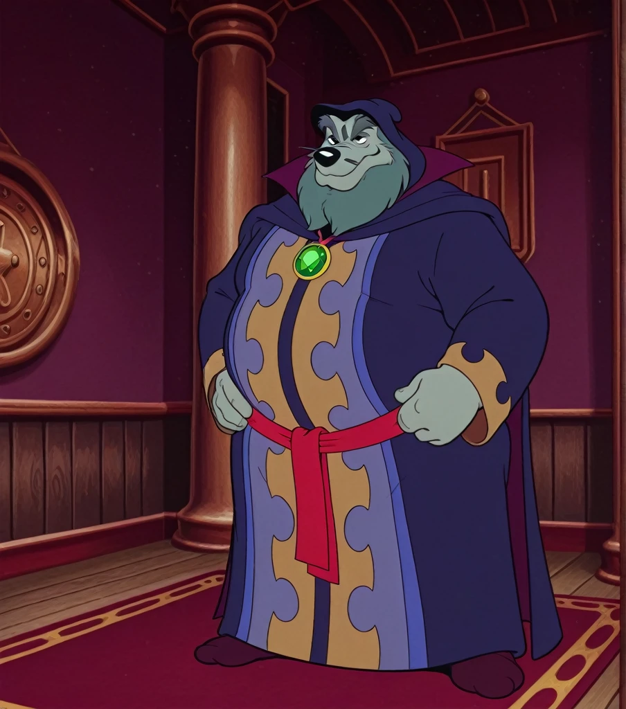 M3RL0CK, mature male, wolf, light gray body, dark gray hair, thick eyebrows, mustache, beard, hood, robe, purple robe, green tallisman, fat