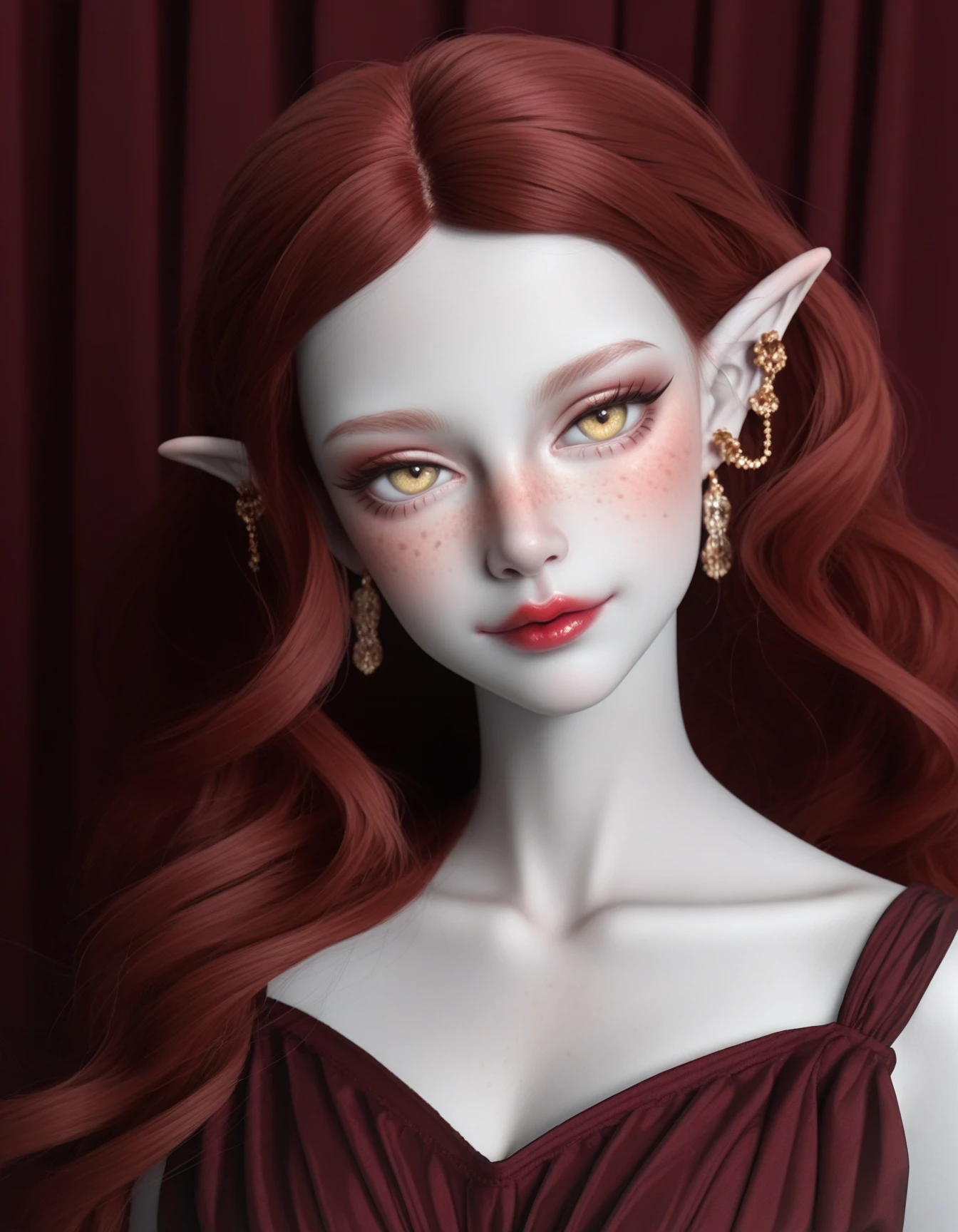 xnaomix, long hair, red hair, yellow eyes, freckles, pale skin, pointy ears, makeup, lipstick, eyelashes