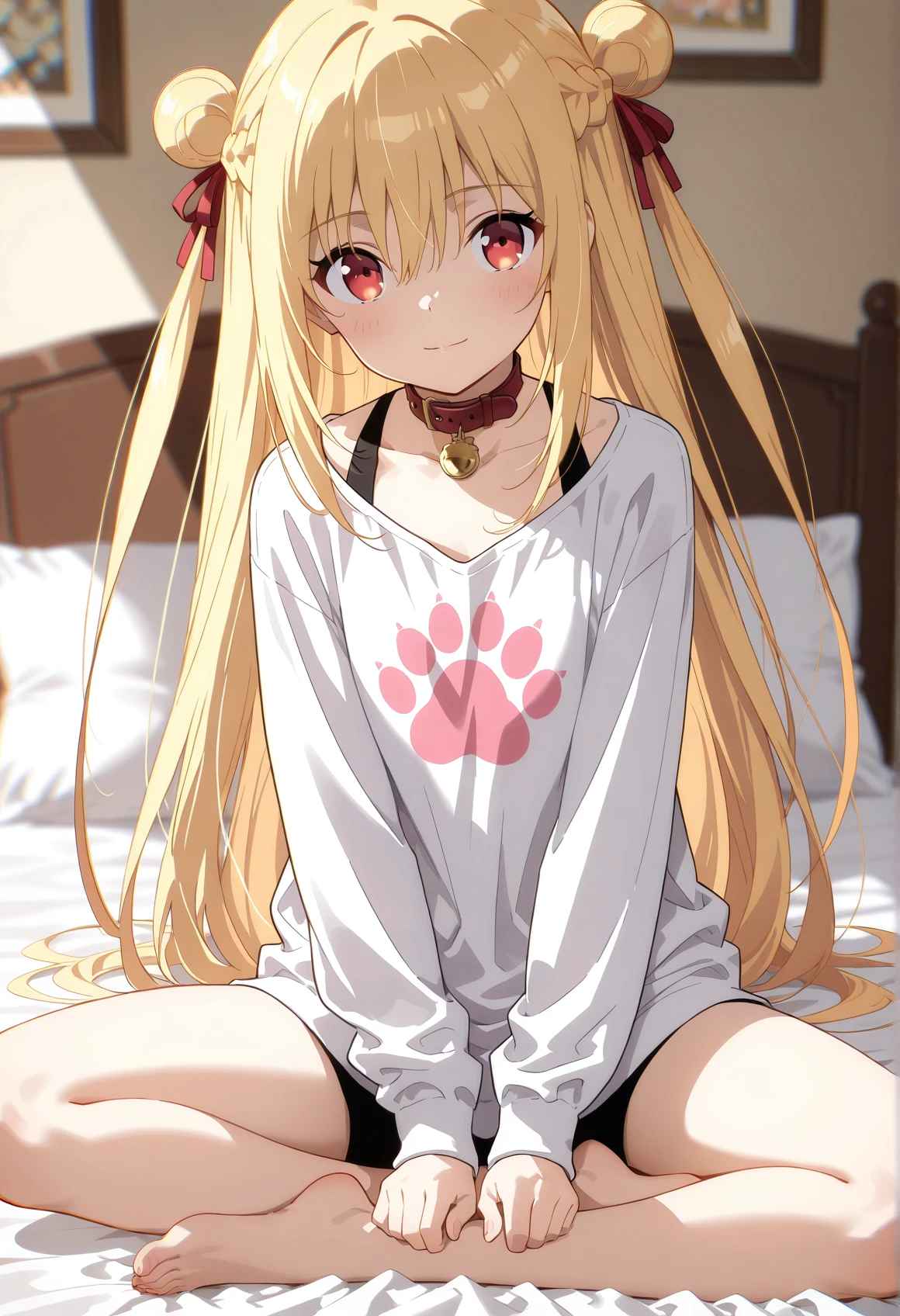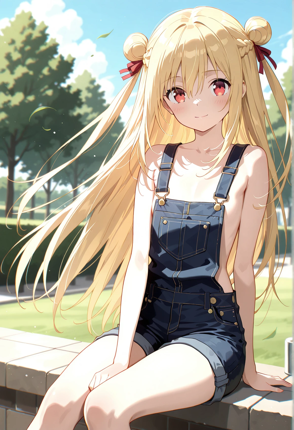 Melida_Angel,blonde hair,braid,chromatic aberration,flat chest,french braid,hair between eyes,hair bow,hair bun,hair ribbon,red eyes,red ribbon,side ponytail,sidelocks,two side up,very long hair,clothes: