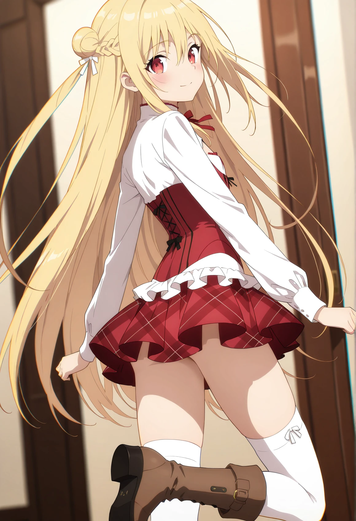 r_dress,red dress,short dress,long sleeves,black bow,cleavage cutout,white breasts cover,corset,neck ribbon,white ribbon,white shirt,frills,red skirt,miniskirt,plaid skirt,pleated skirt,white thighhighs,boots,brown footwear,白ドレス / white dress