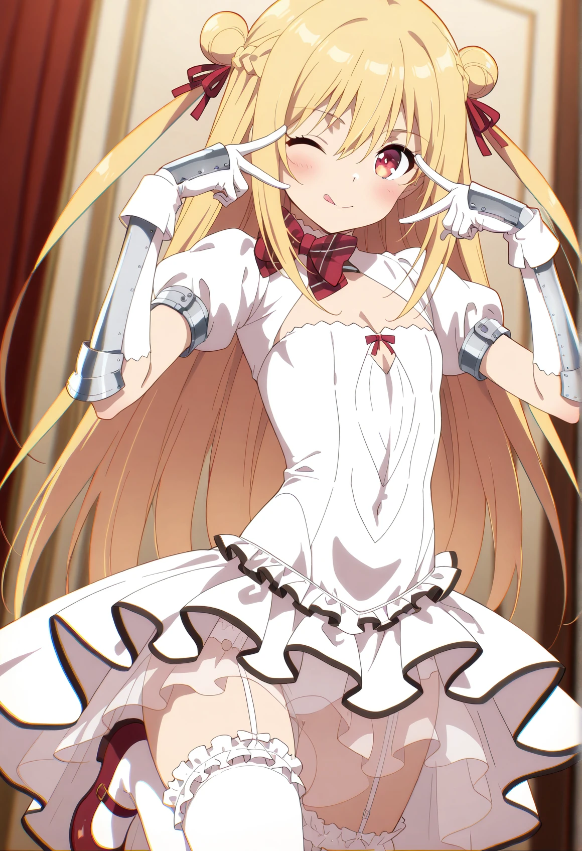 w_dress,armored dress,backless outfit,bowtie,cleavage cutout,covered navel,elbow gloves,frilled thighhighs,garter straps,gauntlets,mary janes,panties,plaid bowtie,pleated dress,puffy short sleeves,red bow,red bowtie,see-through,white dress,white gloves,white panties,white shirt,white thighhighs,Description