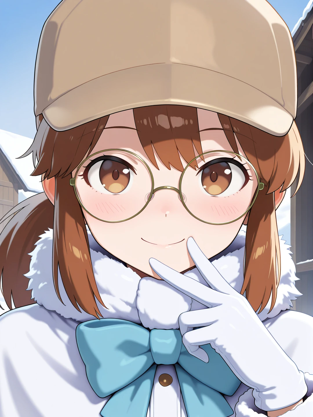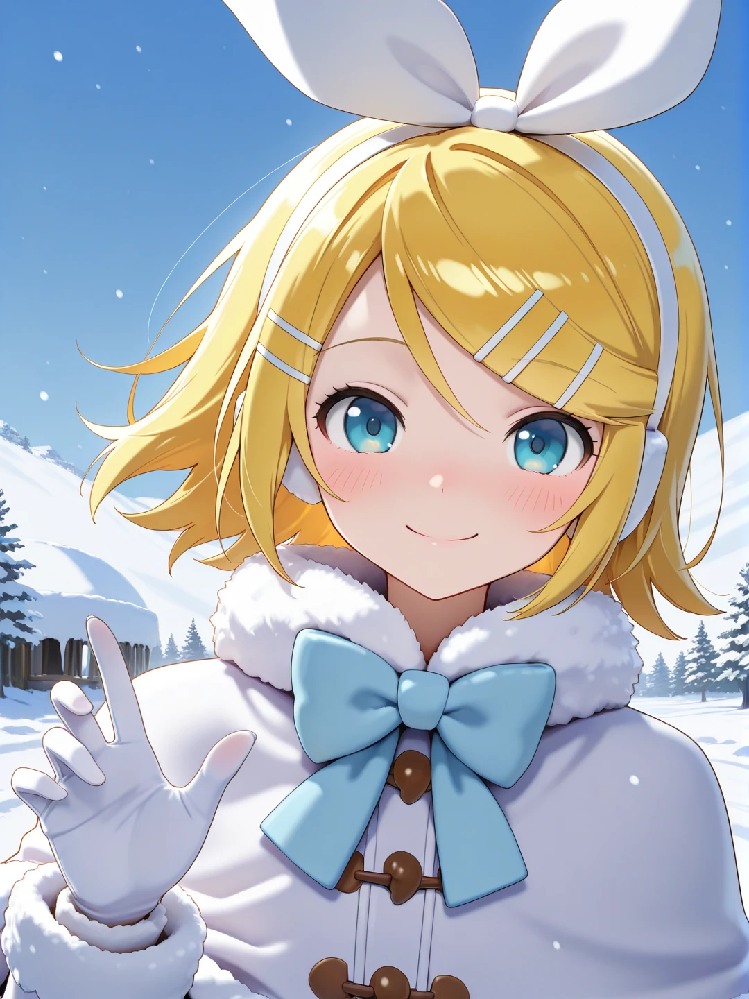 winter clothes,white capelet,jacket under capelet,white jacket,blue bowtie,long sleeves,white gloves,fur trim,white fur,blue skirt,pleated skirt,white pantyhose,boots,white footwear