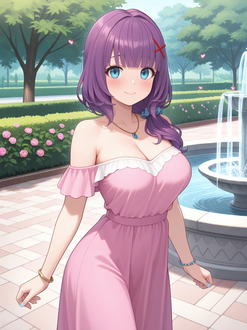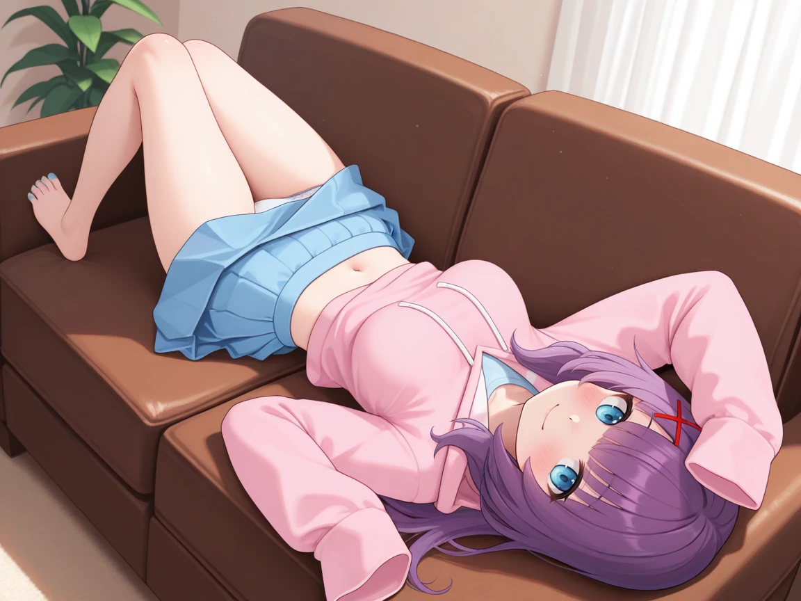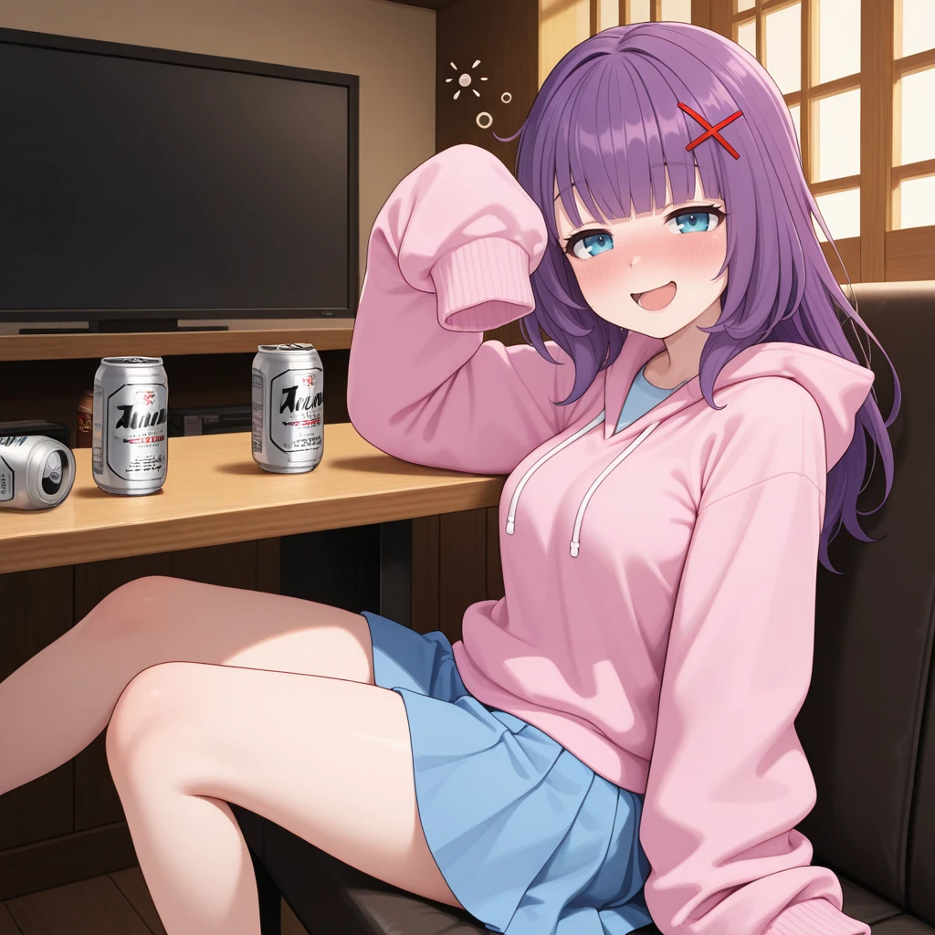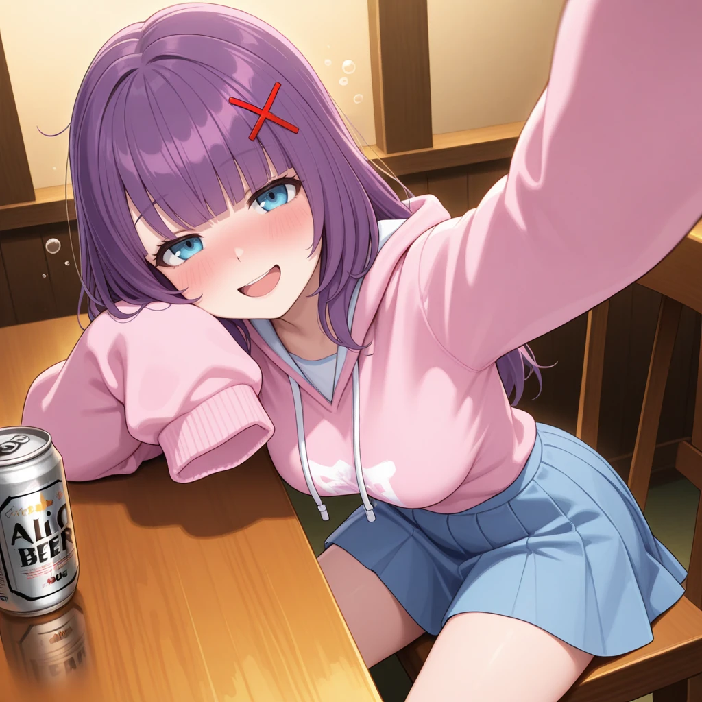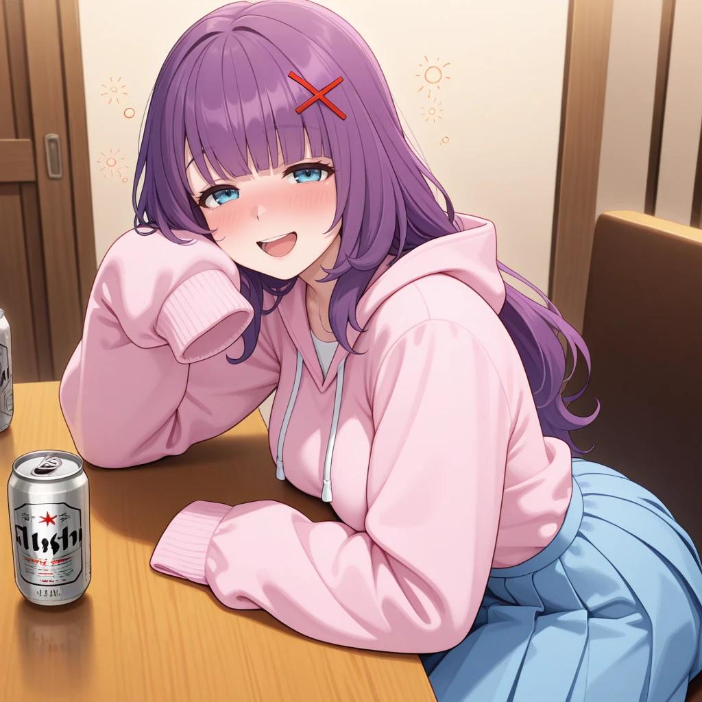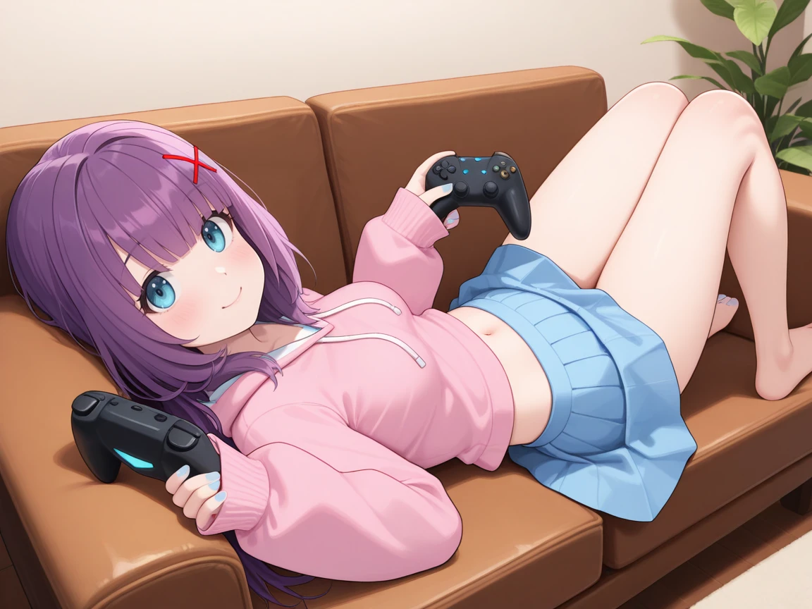 AliceYuki, Purple hair, blue eyes, long hair, x hair ornament,light blue nail polish,medium breasts, pink hoodie,sleeves past fingers, oversized clothes, blue skirt,