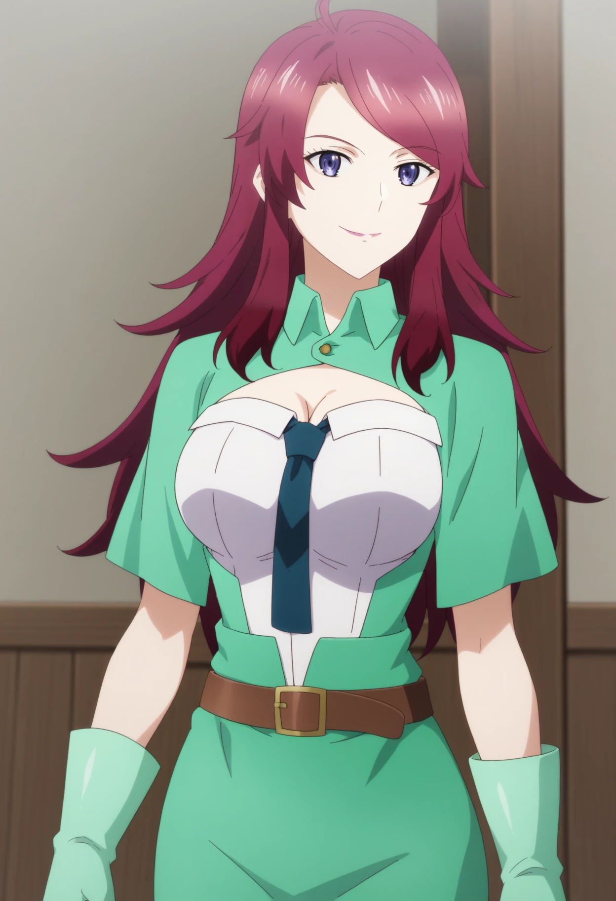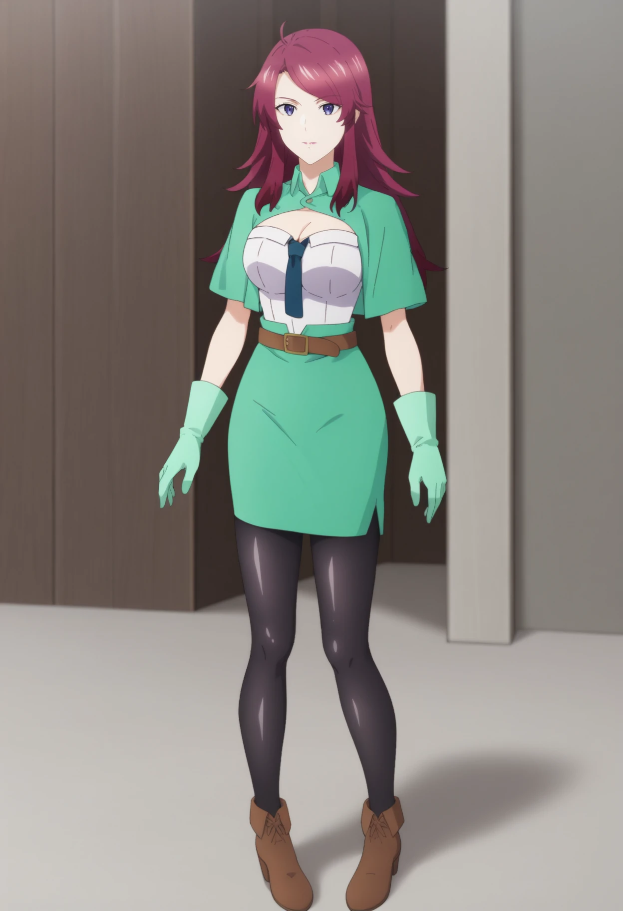 Use "green shirt, cleavage, belt, green gloves, blue necktie, skirt, black pantyhose, collared shirt" for her outfit.