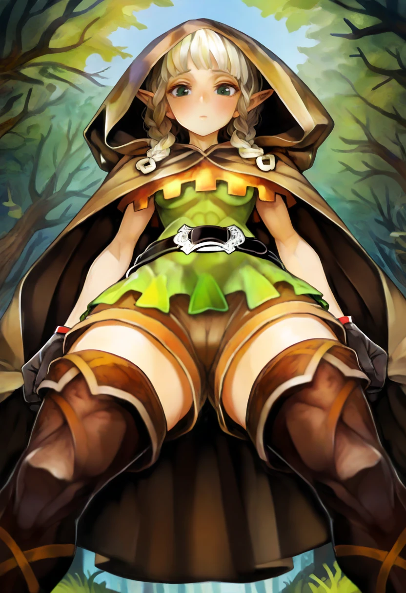 Elf : 1girl, elf \(dragon's crown\), blonde hair, braid, brown eyes,long hair, pointy ears, belt, boots, cloak, gloves, quiver, shorts, solo, thick thighs, thighhighs