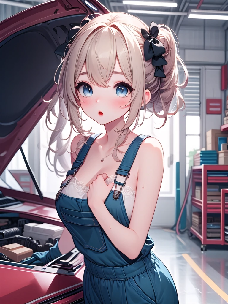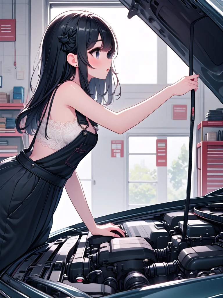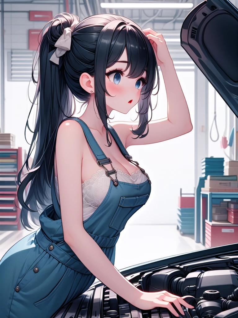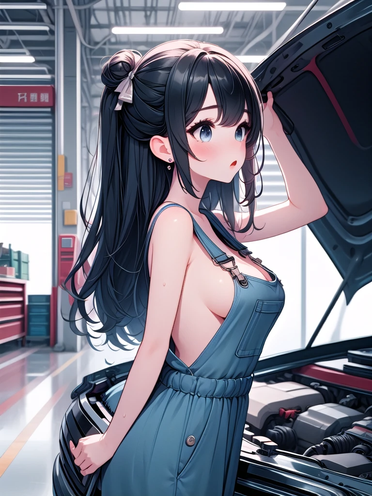 (((open hood))), hood opened, mechanics, nude overalls, leaning forward, upper body, solo, 1girl, shy, sweat, standing, large breasts, mom, entrance, indoors, from side, leaning on vehicle,