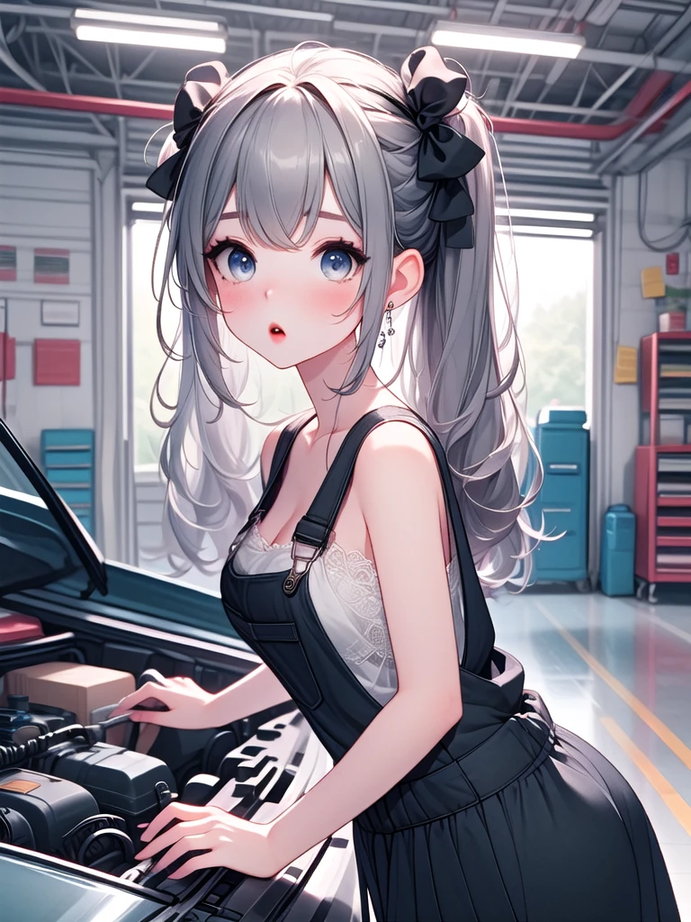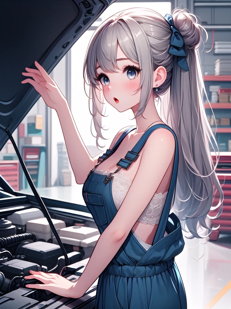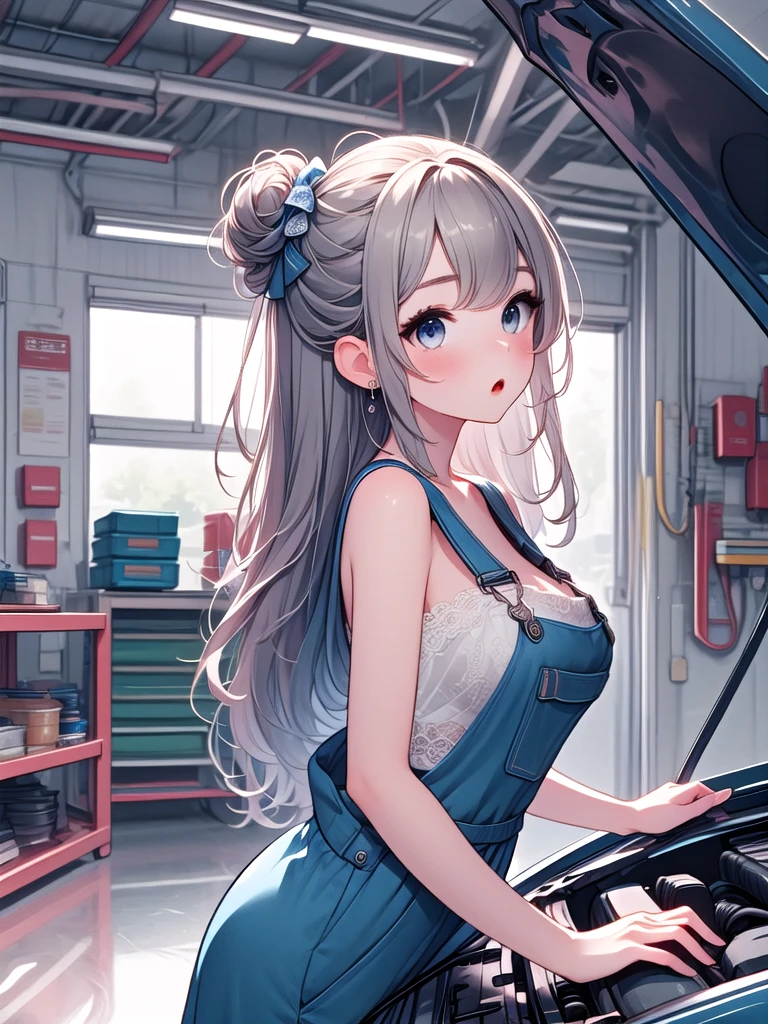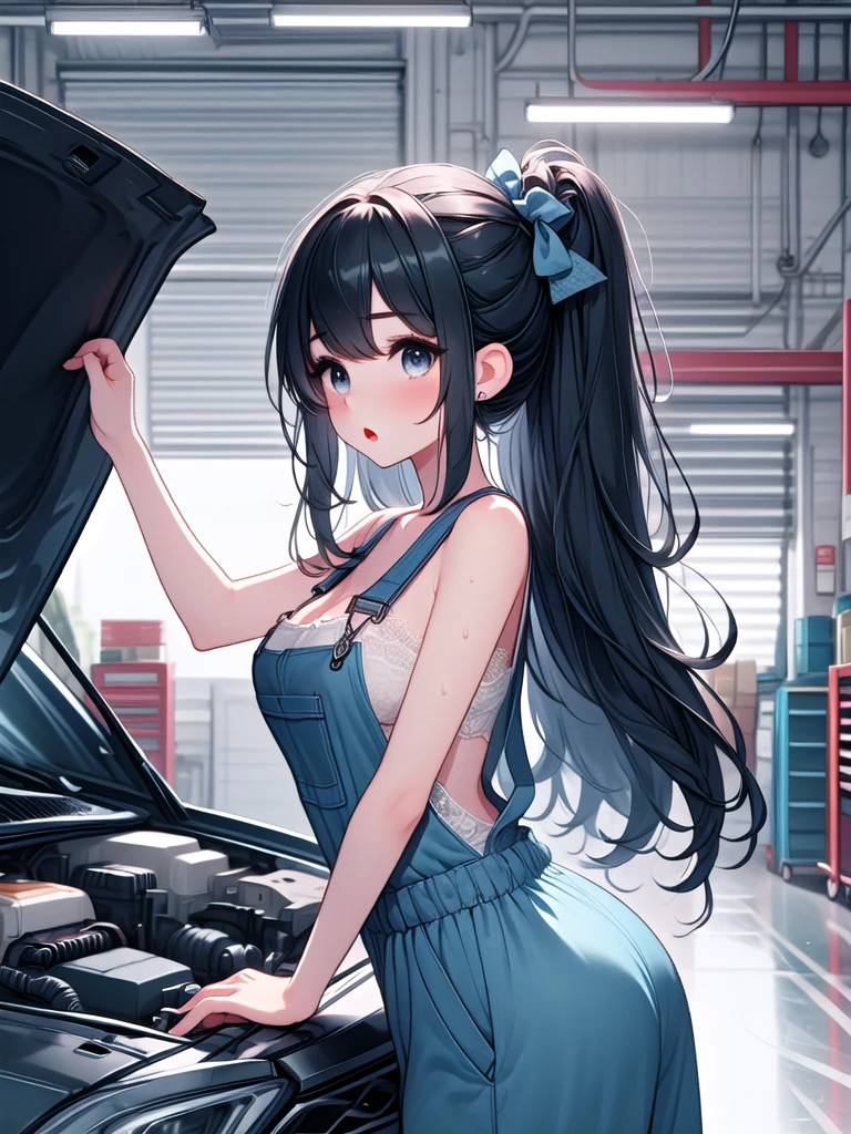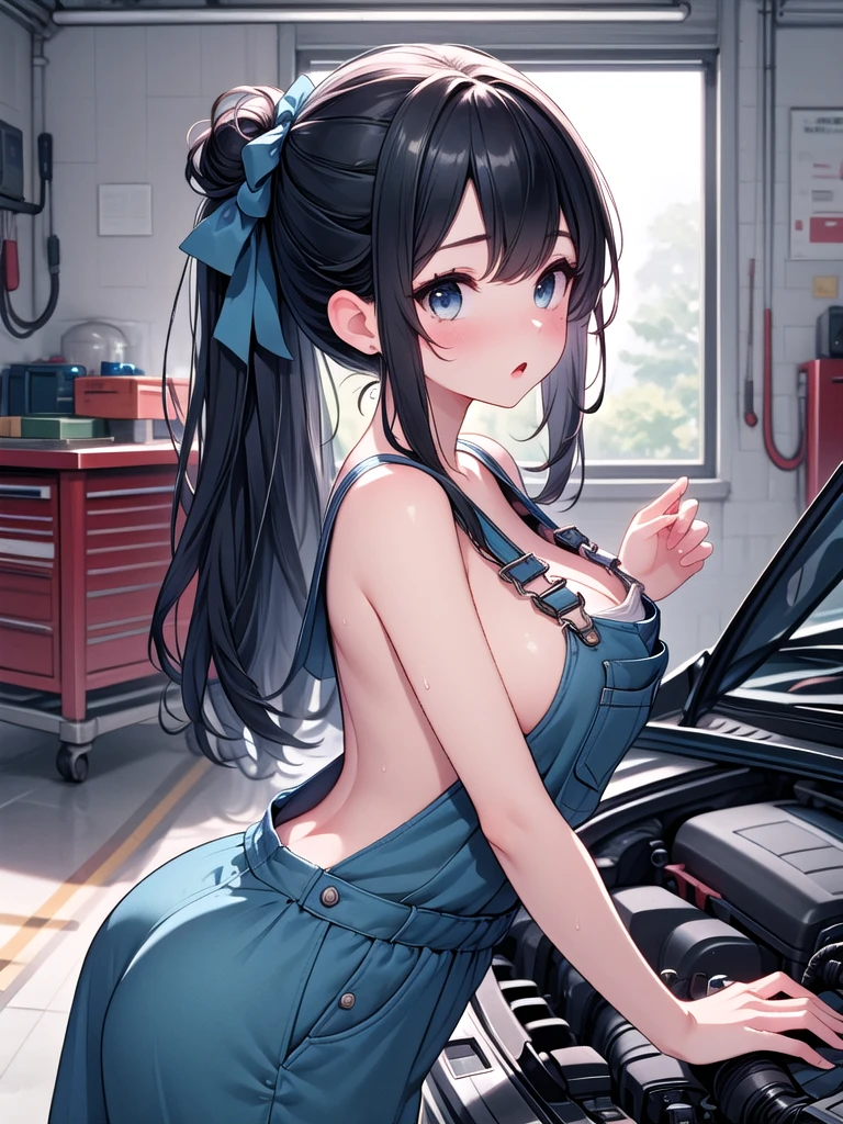 (((open hood))), hood opened, mechanics, nude overalls, leaning forward, upper body, solo, 1girl, shy, sweat, standing, large breasts, mom, entrance, indoors, from side, leaning on vehicle,