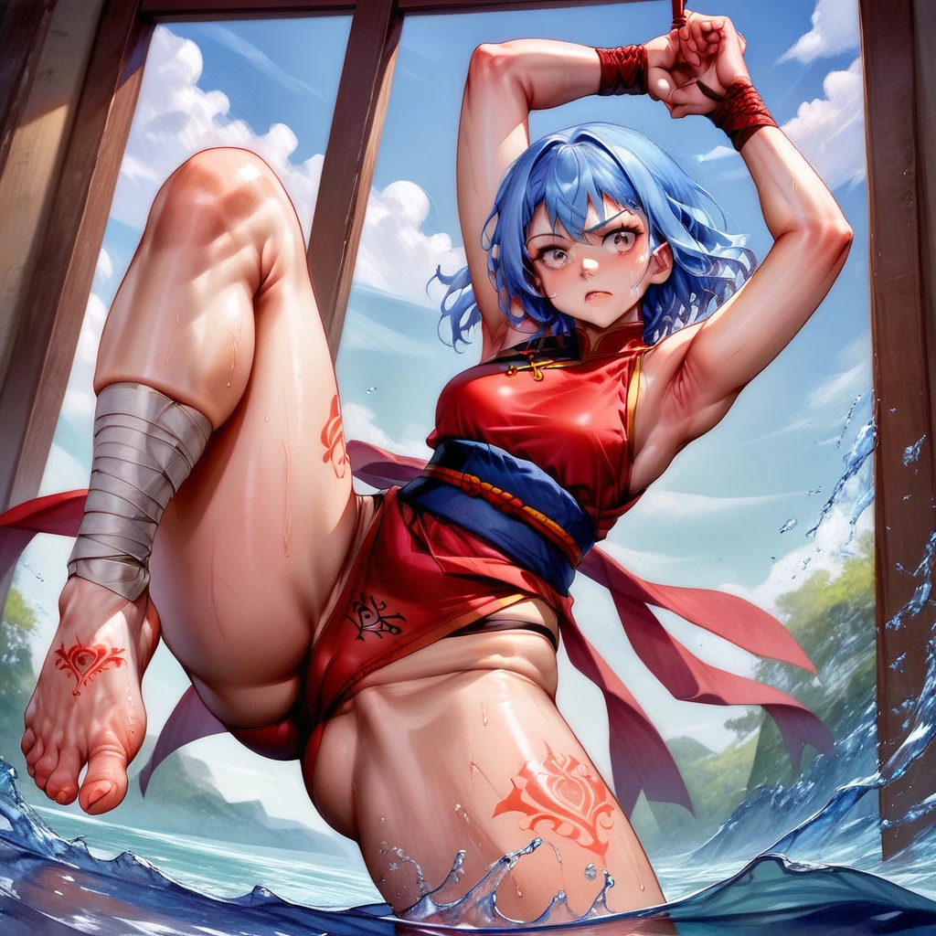 acrobat clothes, high waisted shorts, red and blue and gold clothing, chinese clothes, tights, long sash around waist, leg wraps, foot wraps,
