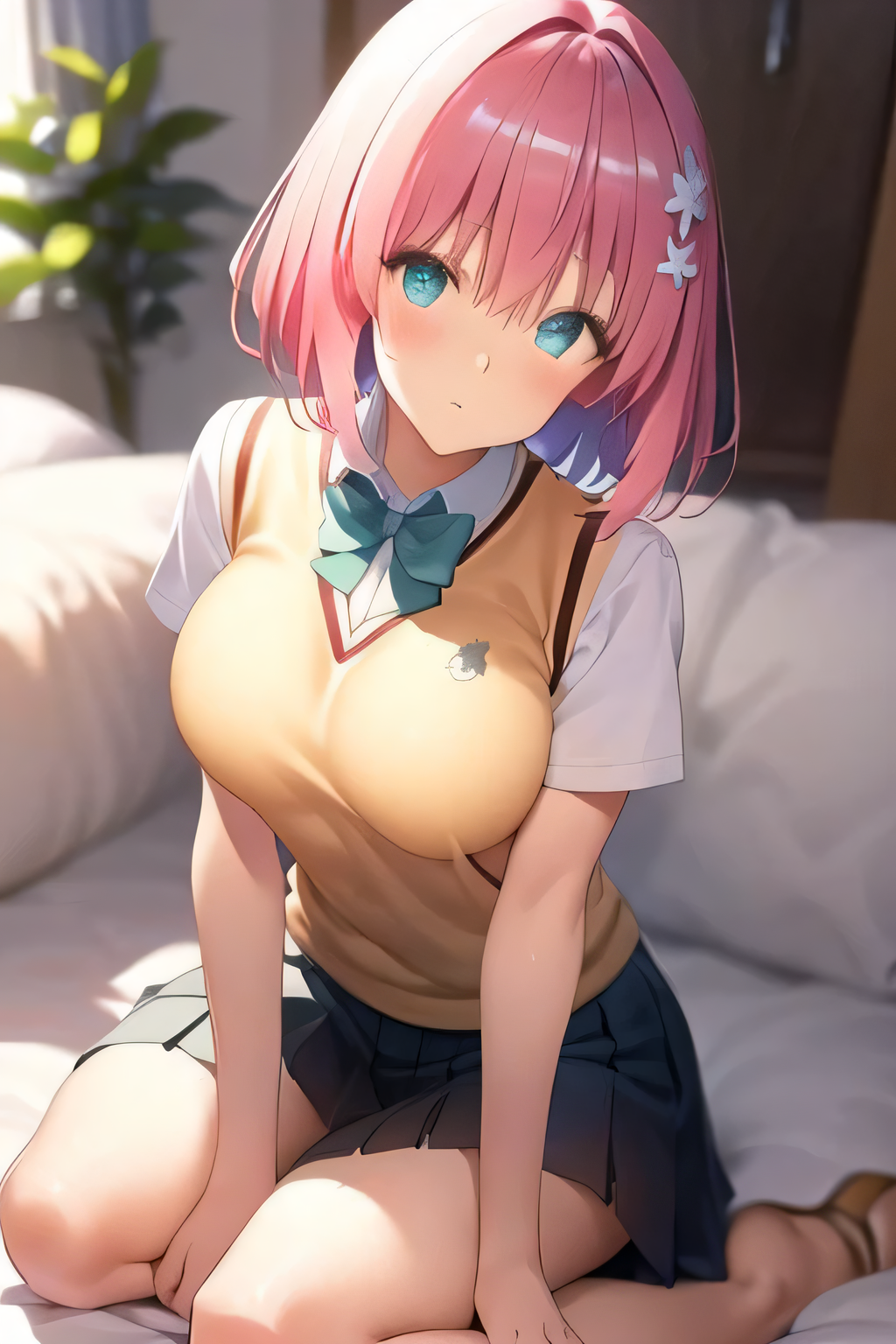 momo_a, hair ornament, bob cut, short hair, pink hair, green eyes,
