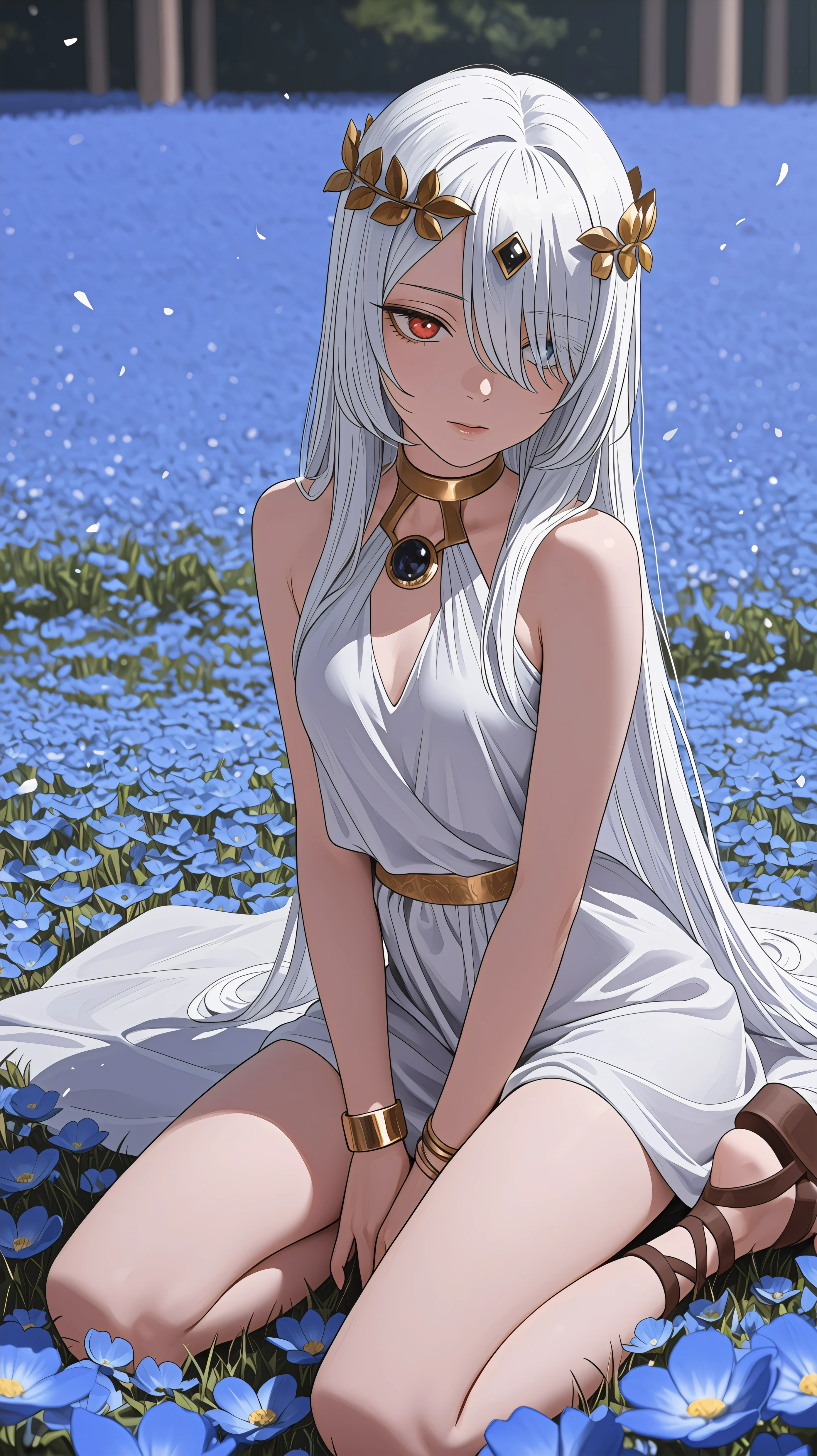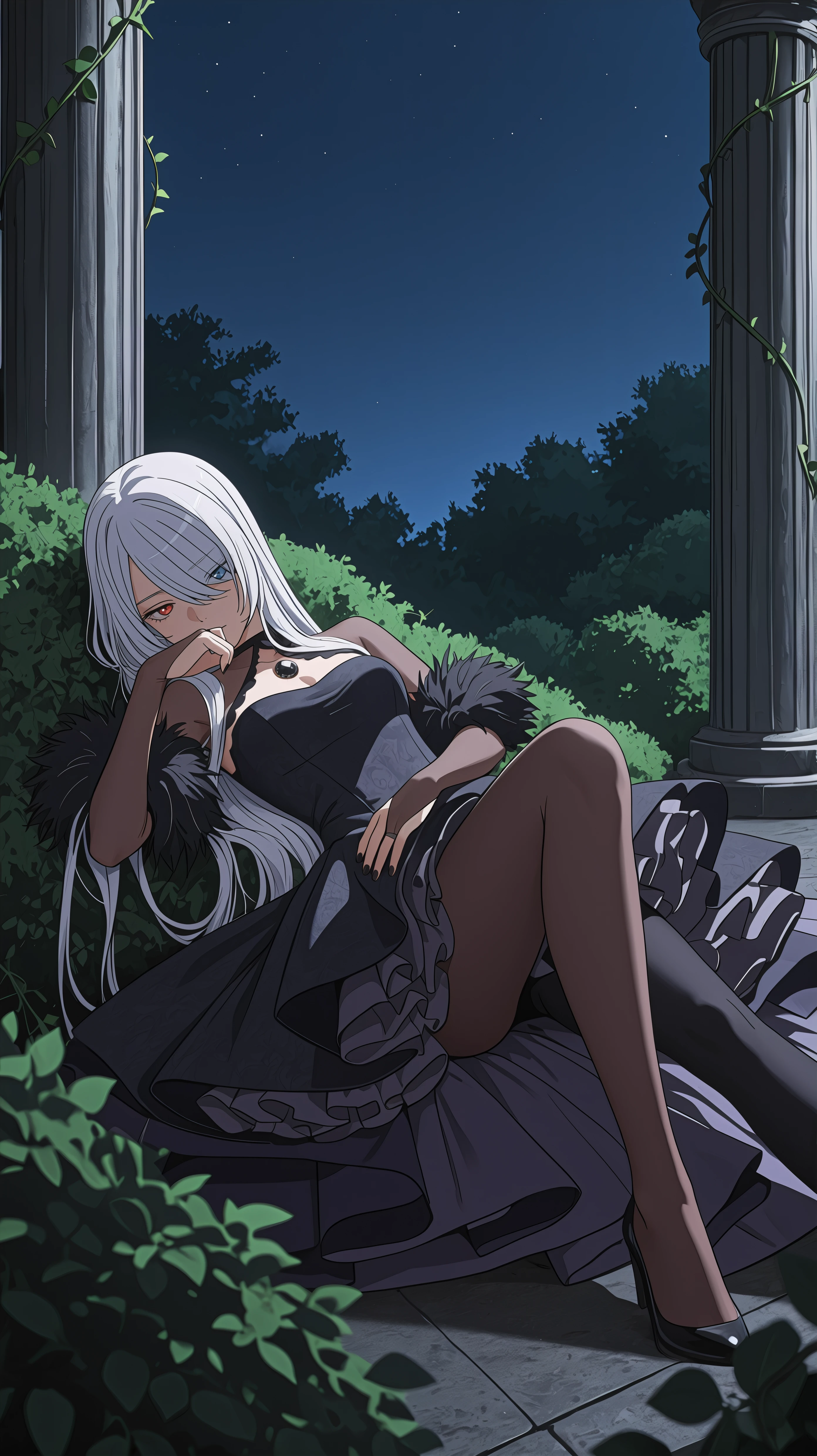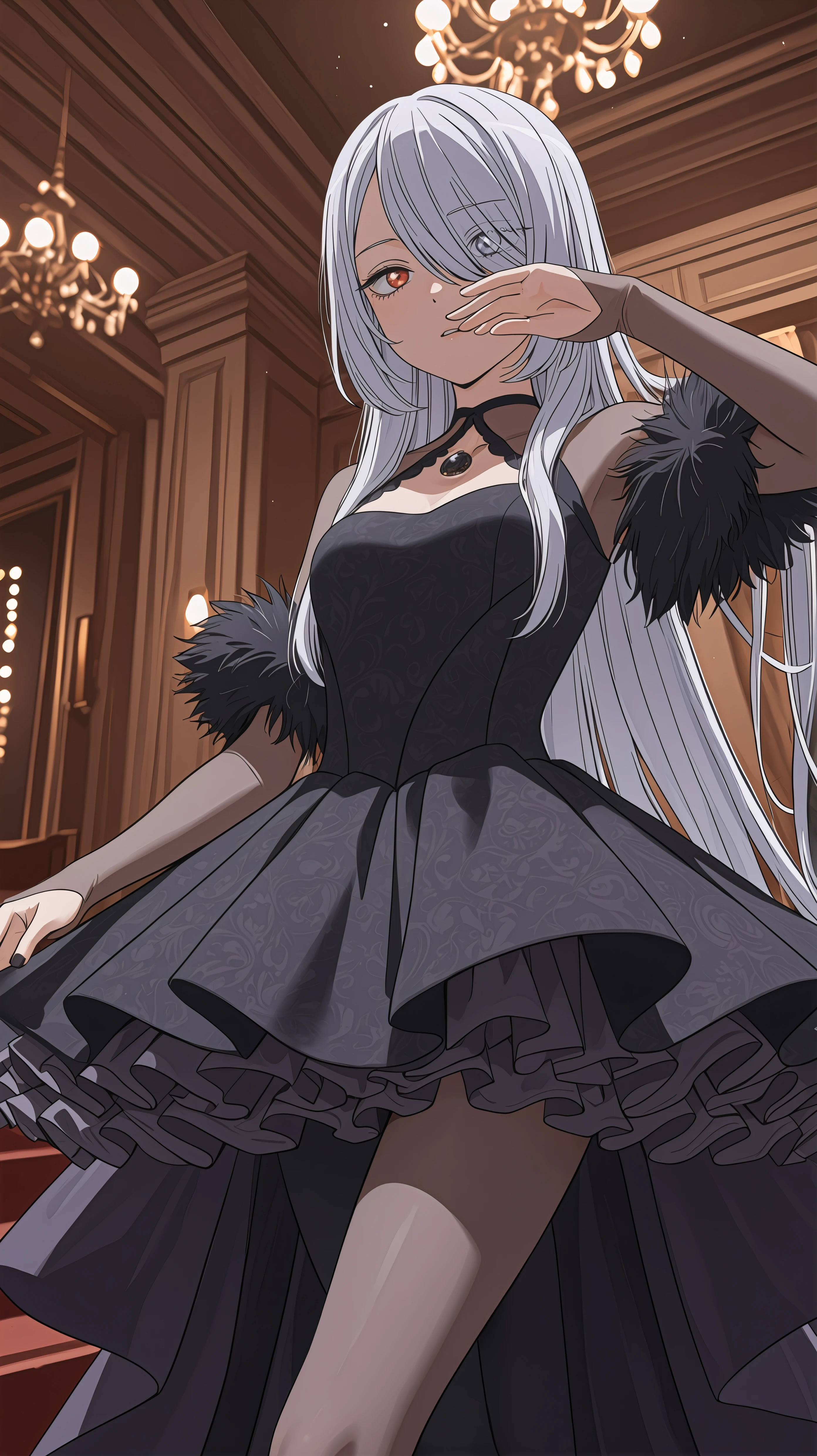 black_lobelia_sajuna, long hair, white hair, heterochromia, red eye, blue eye, hair covering face, hair over one eye, black dress, fur trim, gemstone, bridal gauntlets, dark purple frills, layered frills, layered dress, single leg pantyhose,Description