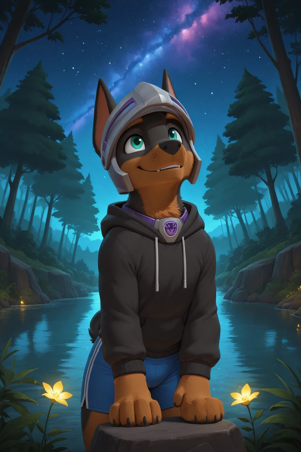 Mensajes de refuerzo: " domestic dog, male, teal eyes, black fur, brown body "