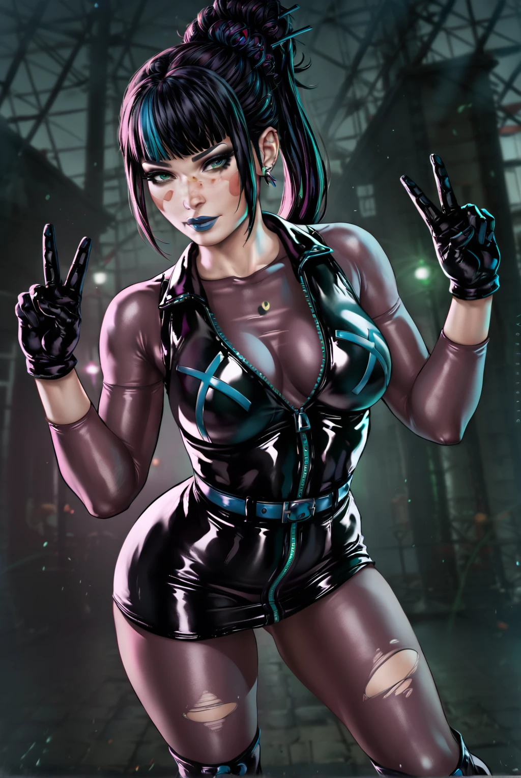 long hair, black hair, green eyes, blue hair, ponytail, multicolored hair, two-tone hair, streaked hair, blue lips, blunt bangs, blue eyeshadow, blue lips, makeup,