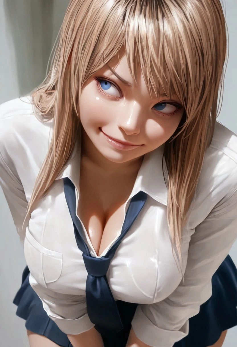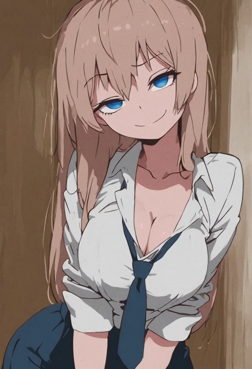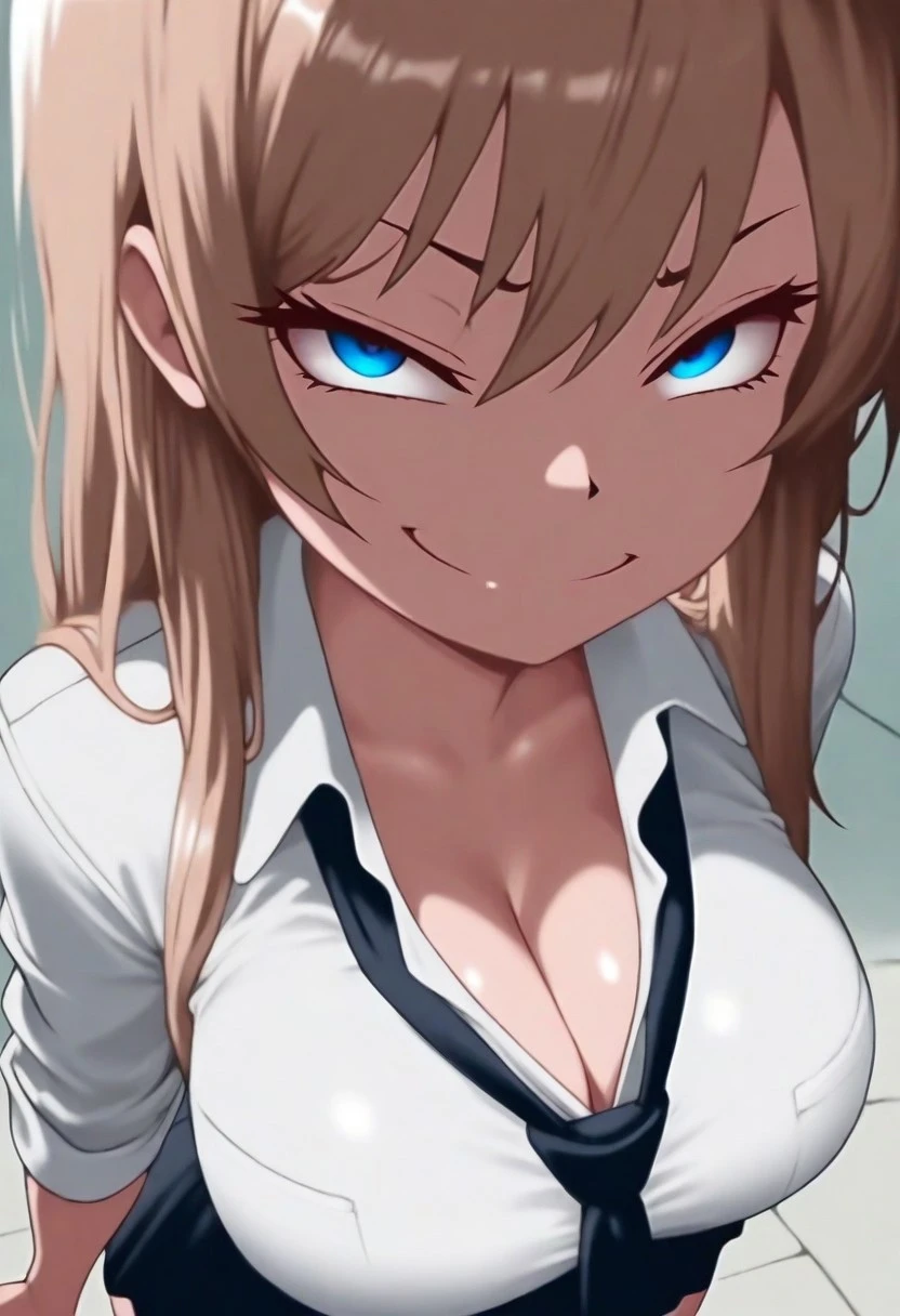 chiyaki, 1girl, bown hair, blue eyes, long hair, necktie, shirt, white shirt, hair beetween eyes, skirt,