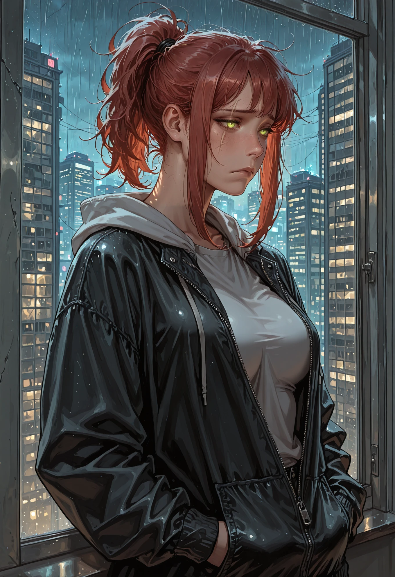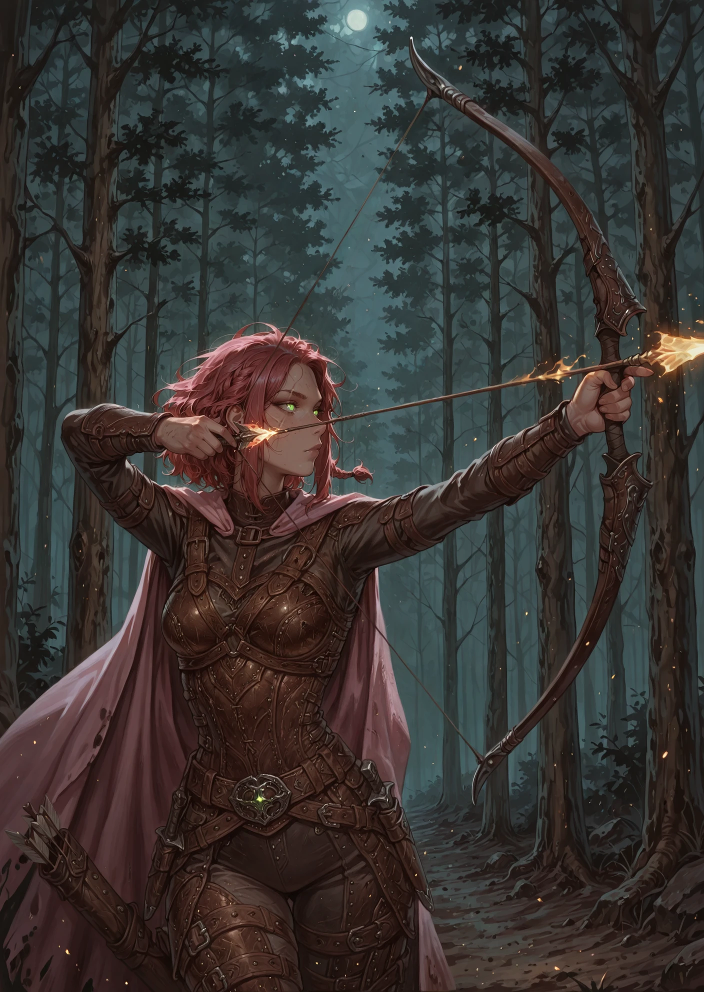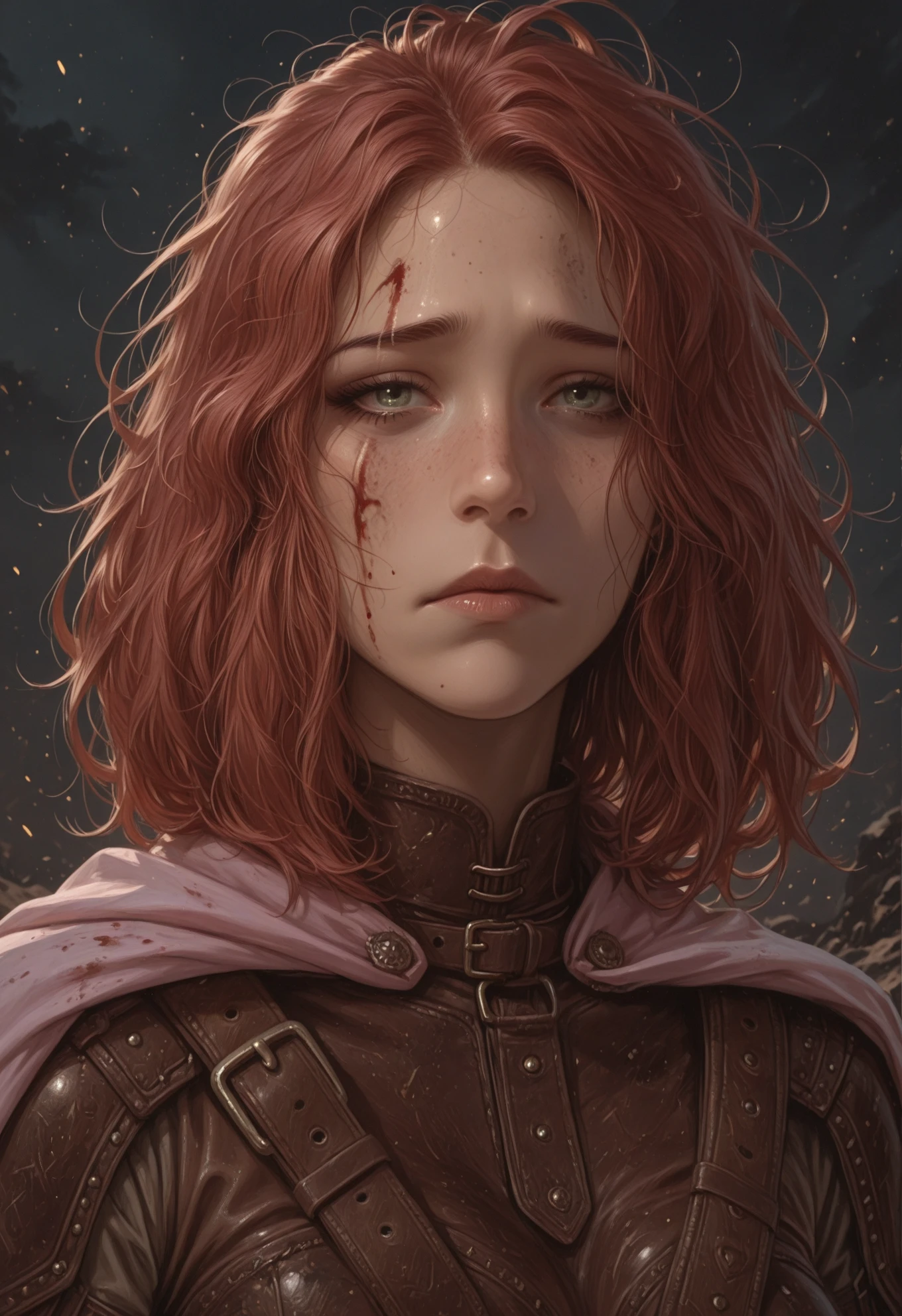 1girl, ImoenBG, green eyes, light scar on face, medium hair, messy hair, leather armor, pink cape