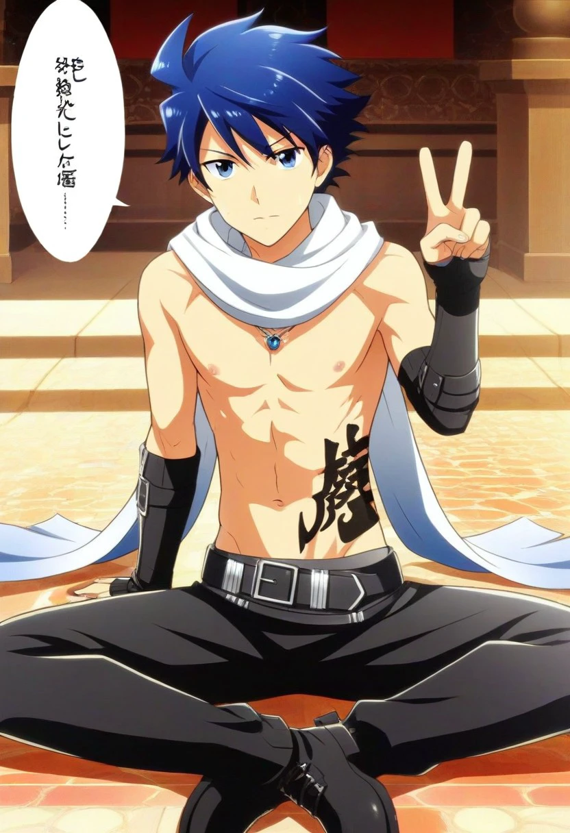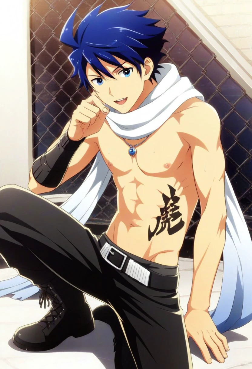 white long scarf, necklace, sleeveless blue and black outfit with belt buckles, black arm warmers, abdomen tattoo, belt, black pants, black boots