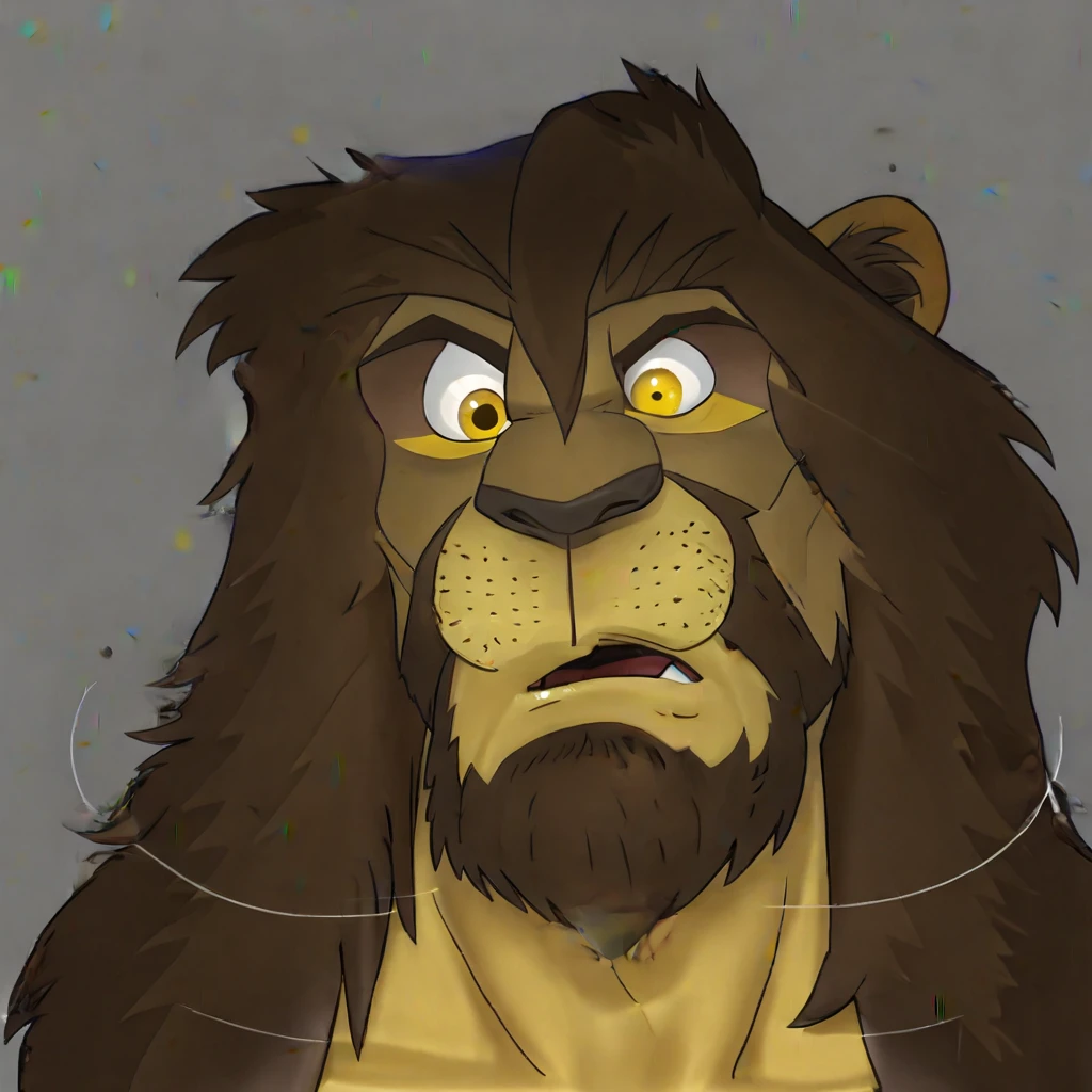 galen dhaelos, mitzakan, dilacted pupils, white sclerals , yellow iris, dilacted dark pupils ,left pupil is big , right pupils small , 1boy , head shot brun mane, little brun beard , identical colors furs ,open mouth dized, hd ,night background , lion anthro ,identical, differents pupils sizes