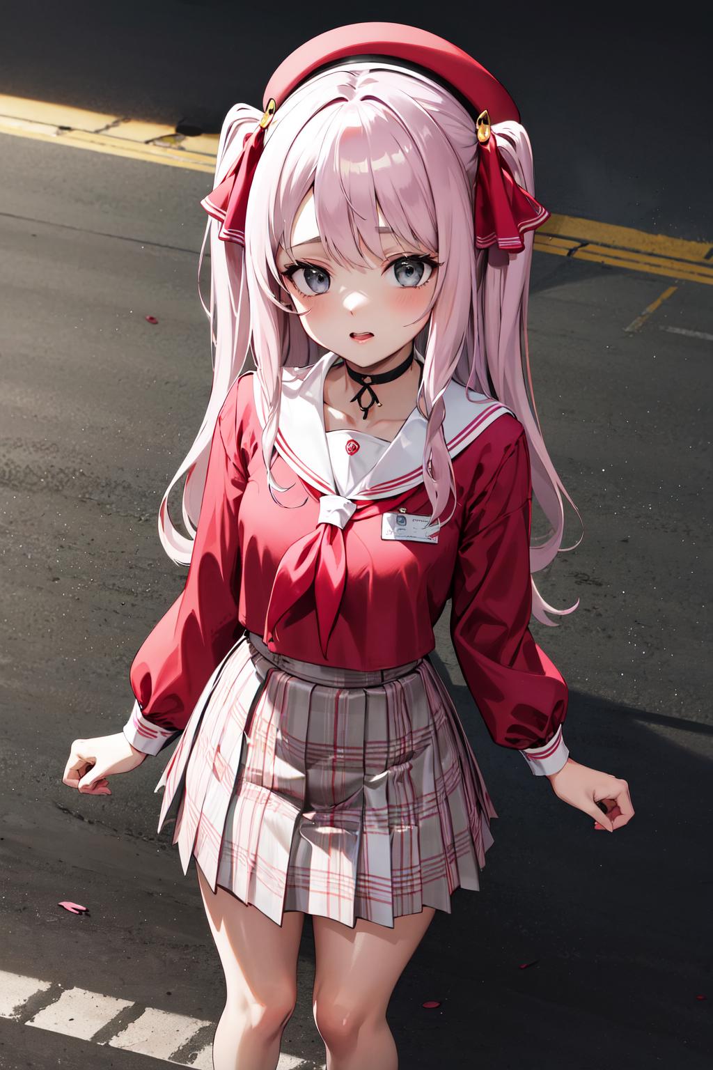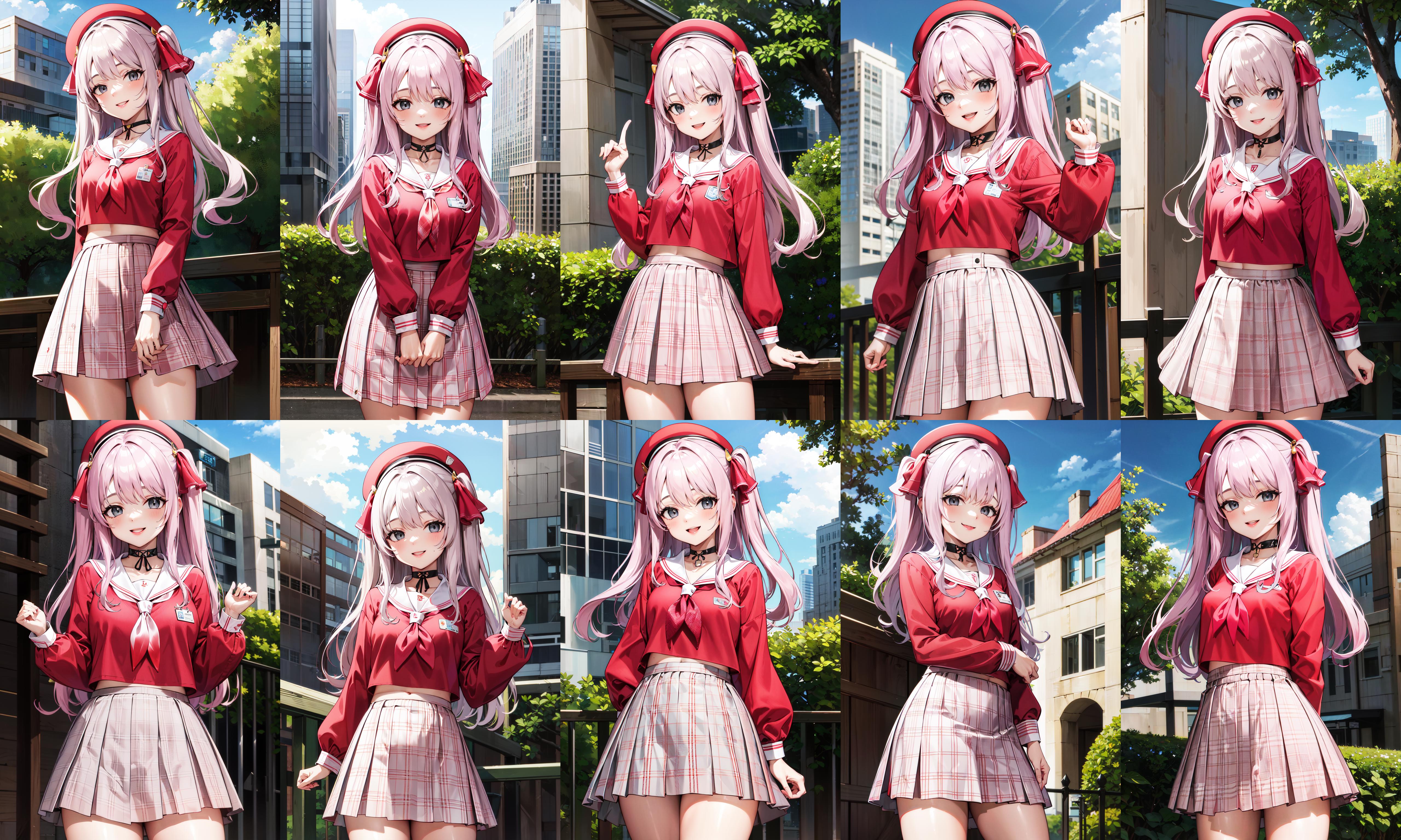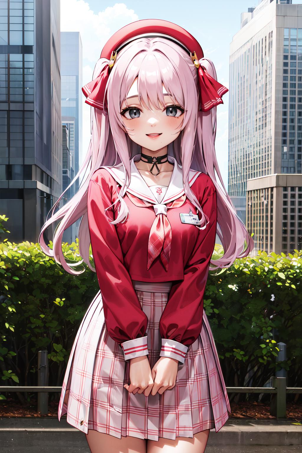 bbyuni, two side up, hair ribbon, hat, beret, choker, school uniform, sailor collar, neckerchief, red shirt, long sleeves, plaid skirt, pink skirt