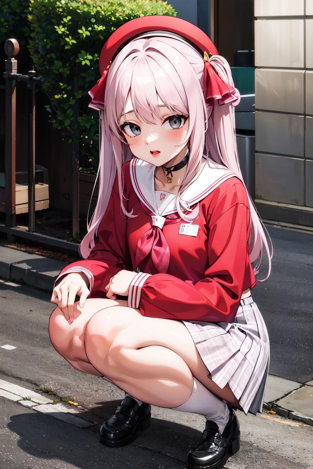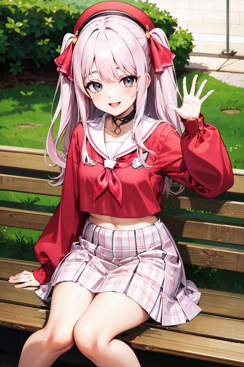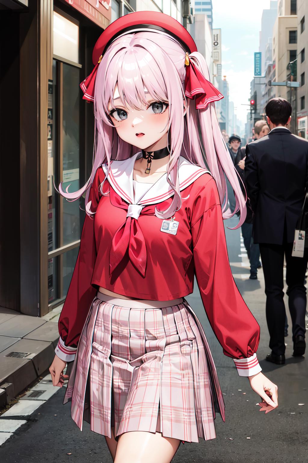 bbyuni, two side up, hair ribbon, hat, beret, choker, school uniform, sailor collar, neckerchief, red shirt, long sleeves, plaid skirt, pink skirt