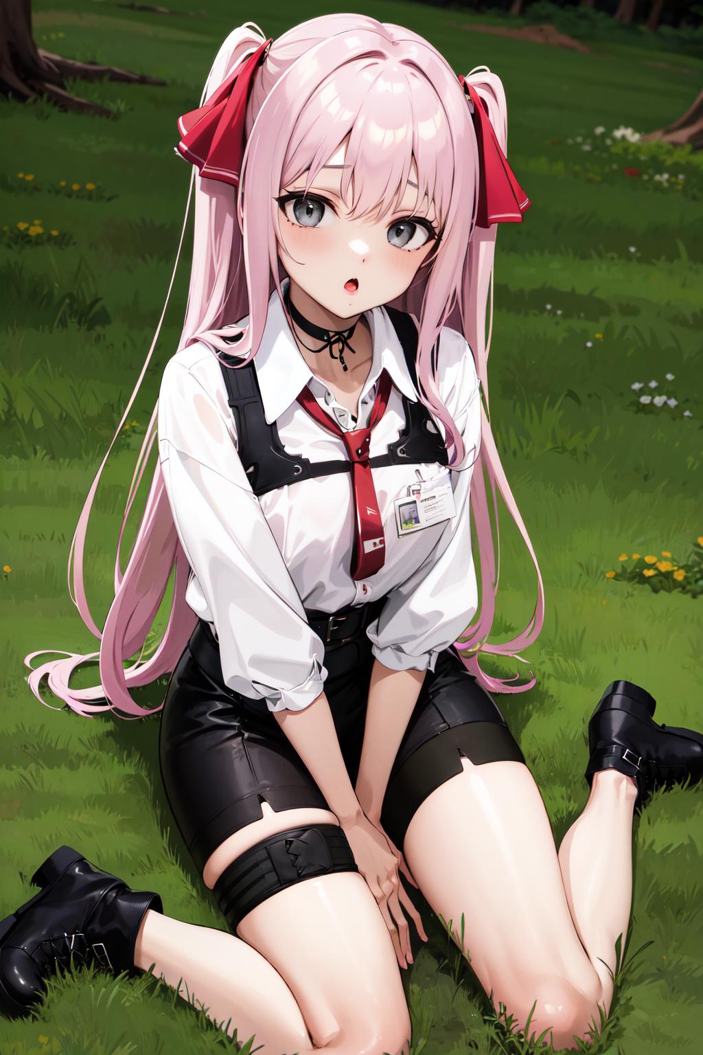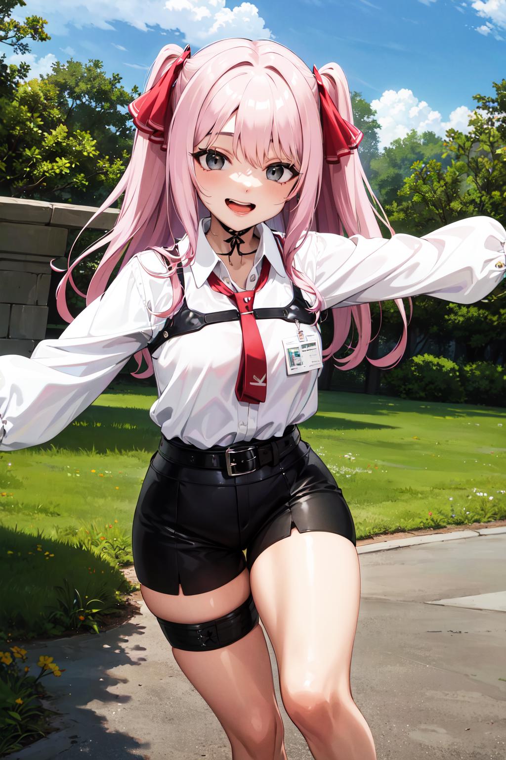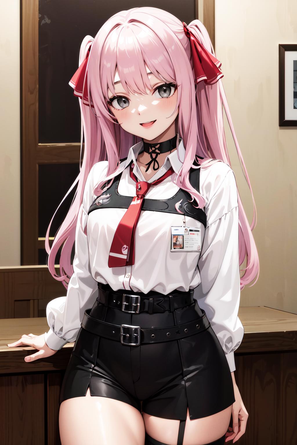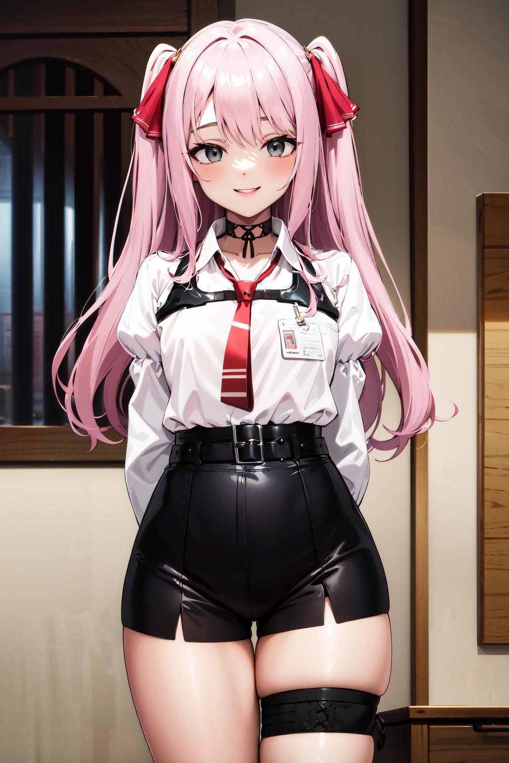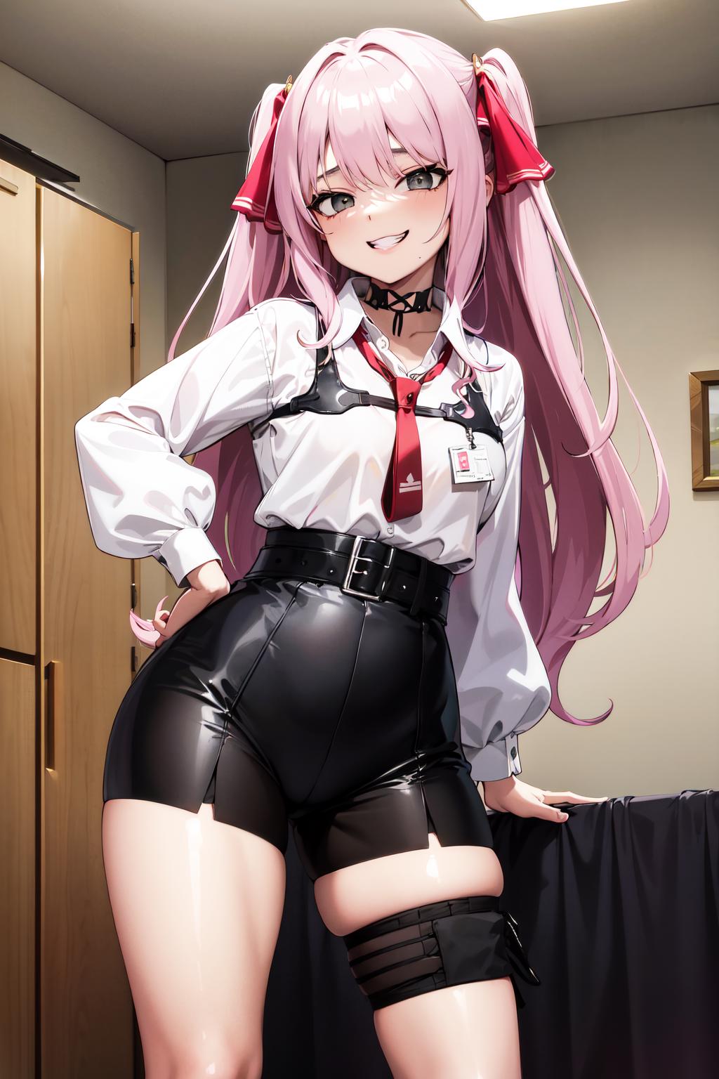 aayuni, two side up, hair ribbon, black choker, grey eyes, red necktie, harness, (white shirt:1.1), collared shirt, puffy sleeves, black belt, black shorts, high-waist shorts, thigh strap