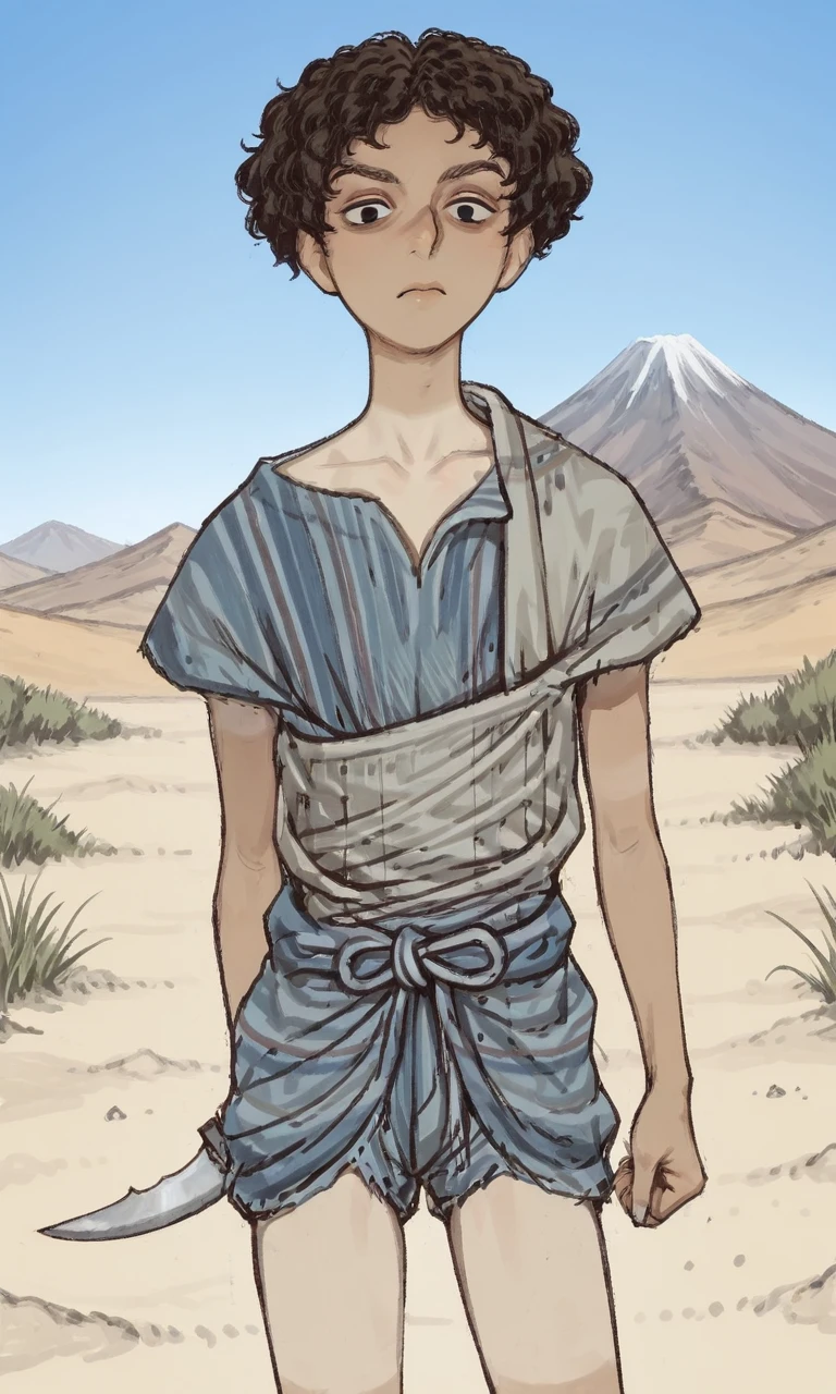 sicarius, black eyes, short hair, brown hair, tan, one-piece tan, curly hair
