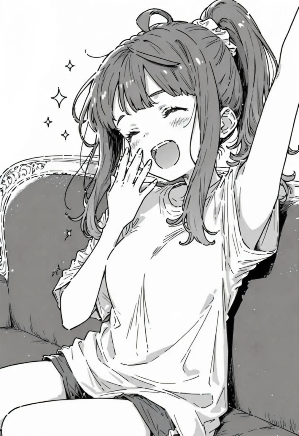 greyscale,monochrome,Yanami Anna,blue eyes,blue hair,long hair,ponytail,yellow hair scrunchie,sidelocks,ahoge,ch9 white shirt,ch9 loose shirt,ch9 long shirt,ch9 t-shirt,ch9 medium sleeves,ch9 dark blue shorts,ch9 white slippers,ch9 open-toe slippers,costume10
