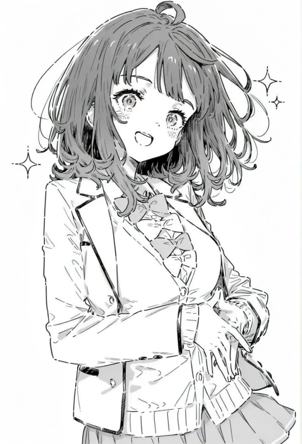 greyscale,monochrome,Yanami Anna,blue eyes,blue hair,medium hair,loose waves hairstyle,ahoge,bangs,ch10 school uniform,ch10 winter uniform,ch10 bowties,ch10 blazer,ch10 winter coat,ch10 white coat,ch10 long sleeves,ch10 breast pocket,ch10 open jacket,ch10 buttons,ch10 white cardigan,ch10 ribbed cardigan,ch10 white shirt,ch10 collared shirt,ch10 light blue skirt,ch10 pleated skirt,ch10 miniskirt,ch10 dark blue socks,ch10 kneehighs,ch10 brown footwear,ch10 loafers,Description