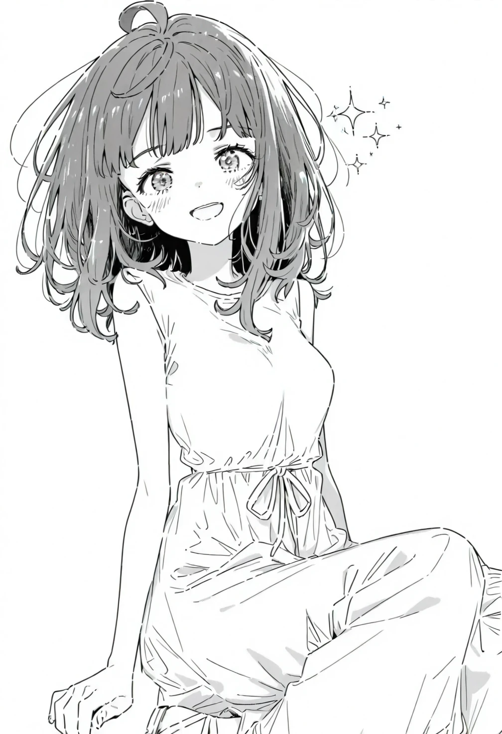 greyscale,monochrome,Yanami Anna,blue eyes,blue hair,medium hair,loose waves hairstyle,ahoge,bangs,ch4 white dress,ch4 sleeveless dress,ch4 long dress,ch4 sandals,ch4 white footwear,costume5