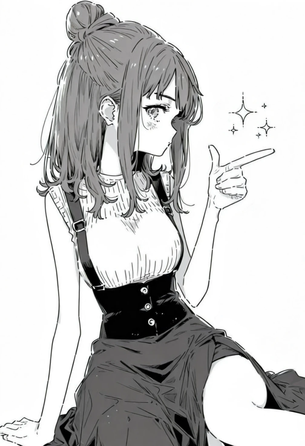 greyscale,monochrome,Yanami Anna,blue eyes,blue hair,long hair,bangs,sidelocks,single hair bun,ch7 white shirt,ch7 ribbed shirt,ch7 sleeveless,ch7 bracelet,ch7 skirt,ch7 black skirt,ch7 suspenders,ch7 suspender skirt,ch7 high-waist skirt,ch7 long skirt,ch7 side slit,ch7 sandals,ch7 white footwear,ch7 platform footwear,costume8