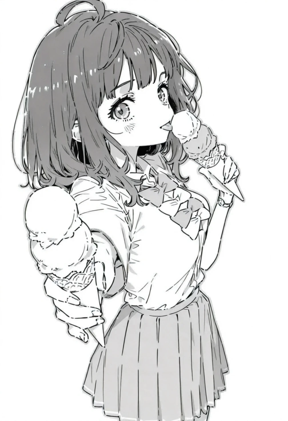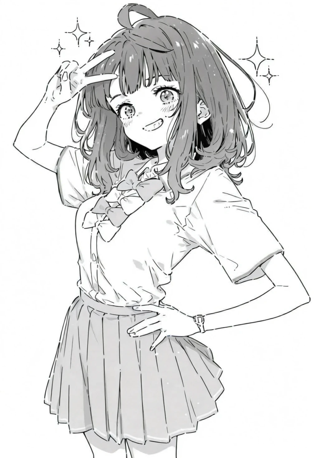 greyscale,monochrome,Yanami Anna,blue eyes,blue hair,medium hair,loose waves hairstyle,ahoge,bangs,ch1 school uniform,ch1 bowties,ch1 white shirt,ch1 collared shirt,ch1 short sleeves,ch1 wristwatch,ch1 light blue skirt,ch1 pleated skirt,ch1 dark blue socks,ch1 kneehighs,ch1 brown footwear,ch1 loafers,costume2