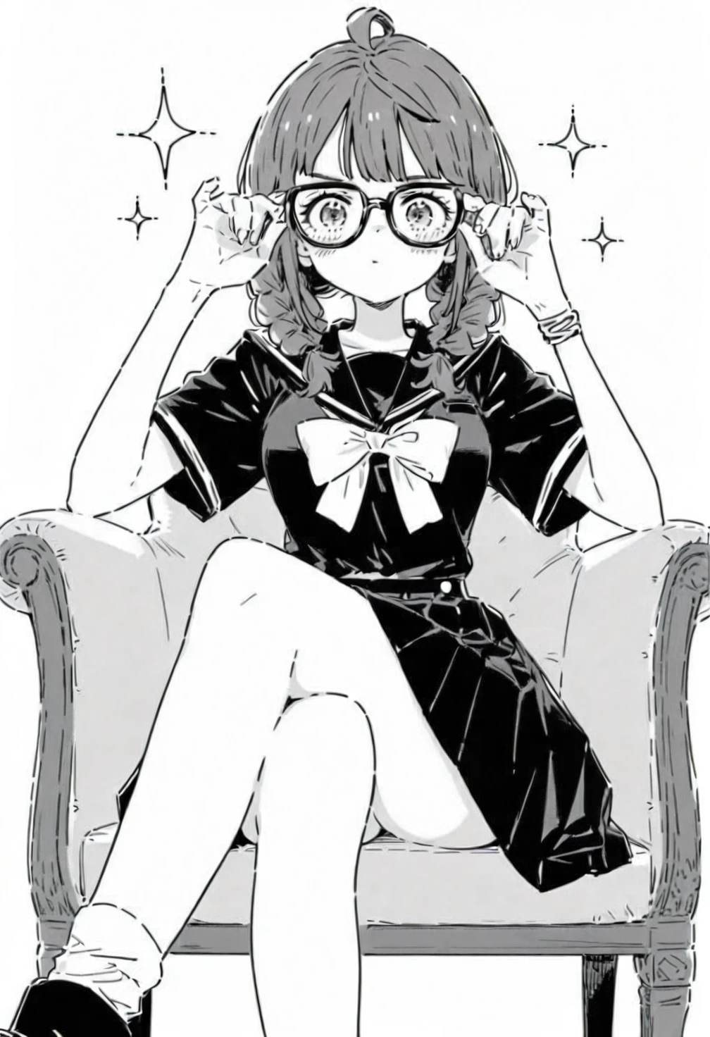 greyscale,monochrome,Yanami Anna,blue eyes,blue hair,medium hair,ahoge,bangs,twin braids,low twin braids,hair over shoulder,straight-on,ch6 glasses,ch6 black-framed eyewear,ch6 round eyewear,ch6 school uniform,ch6 black serafuku,ch6 black sailor collar,ch6 white bowtie,ch6 black shirt,ch6 short sleeves,ch6 bracelet,ch6 black skirt,ch6 medium skirt,ch6 pleated skirt,ch6 ankle socks,ch6 bobby socks,ch6 black footwear,ch6 ankle boots,ch6 high heel boots,costume7
