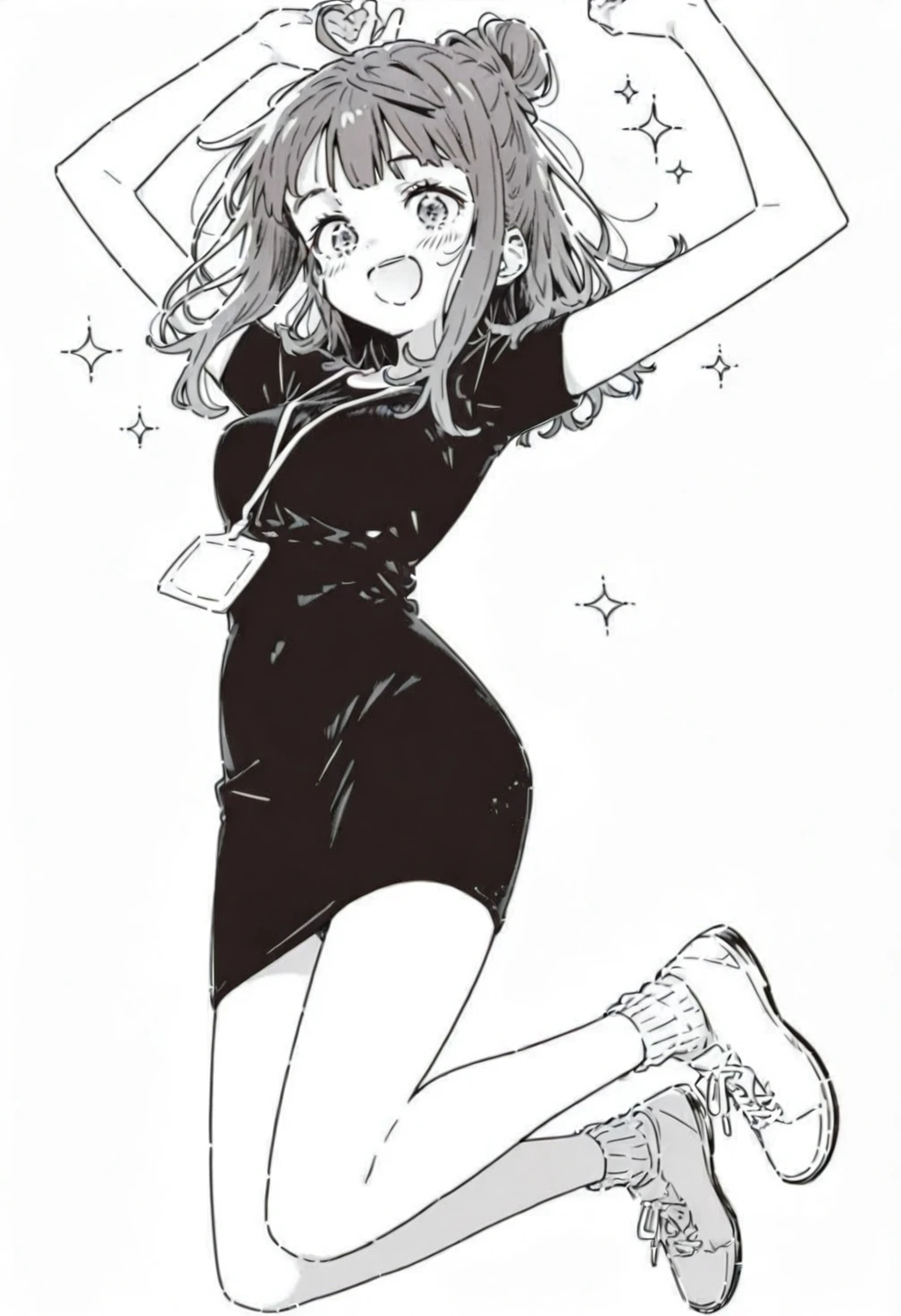 greyscale,monochrome,Yanami Anna,blue eyes,blue hair,medium hair,loose waves hairstyle,hair bun,single hair bun,sidelocks,ahoge,bangs,ch8 lanyard,ch8 camera,ch8 dress,ch8 black dress,ch8 short sleeves,ch8 short dress,ch8 pencil dress,ch8 ribbed socks,ch8 white socks,ch8 ankle socks,ch8 white sneakers,