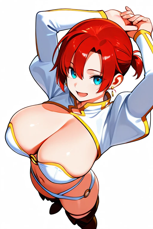 1girl, solo, boudica_(fate), short ponytail, red hair, blue eyes, earrings,