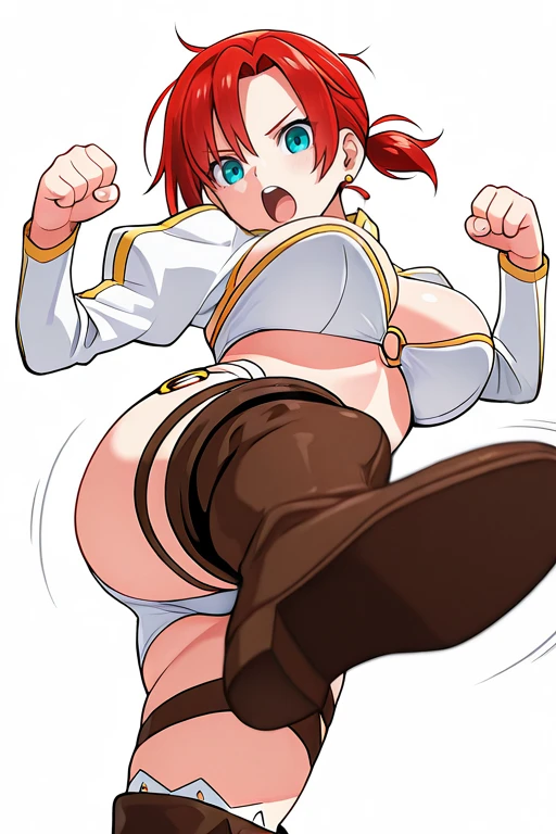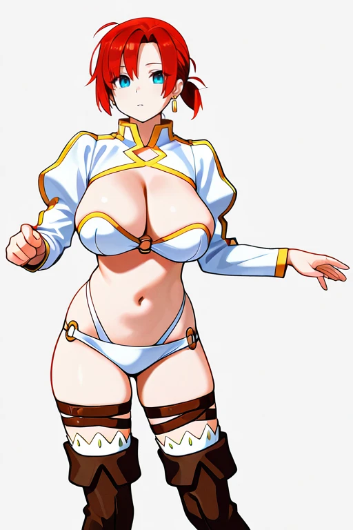 1girl, solo, hdboudica, short ponytail, red hair, blue eyes, earrings,