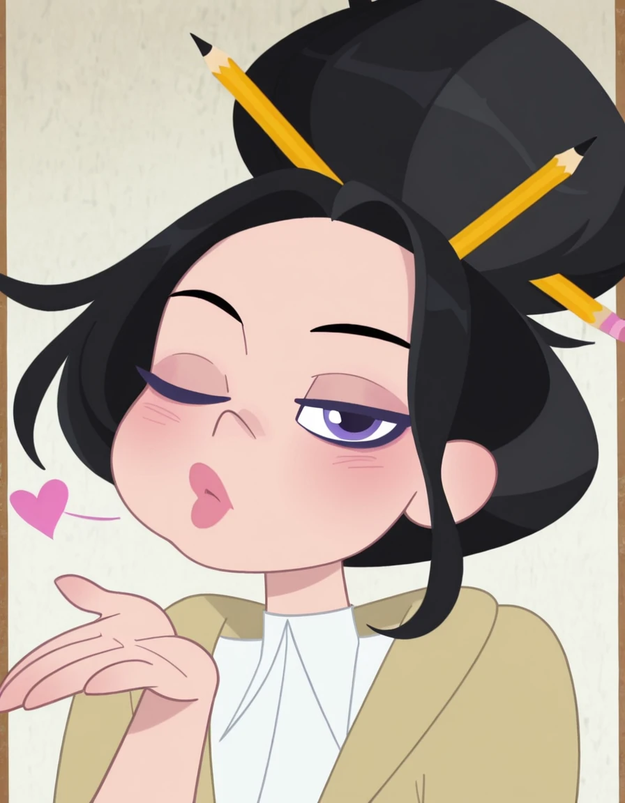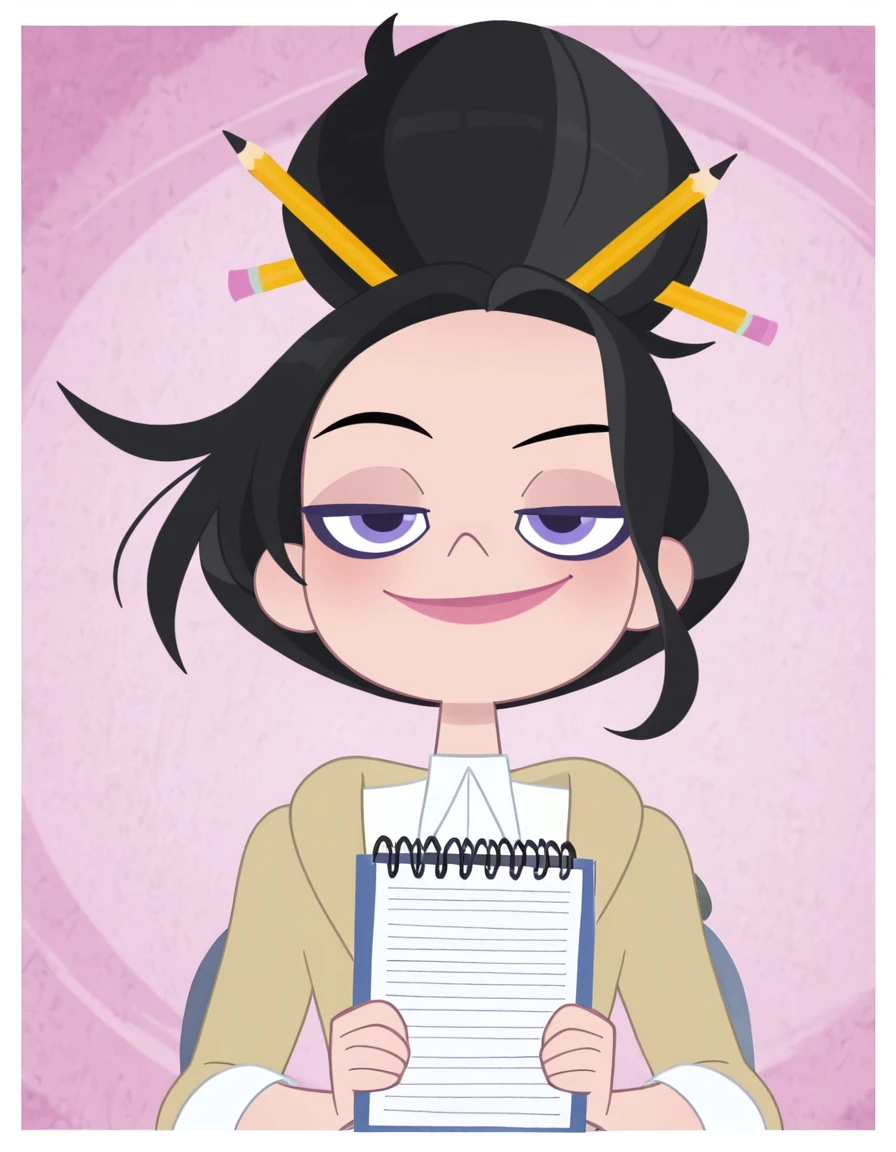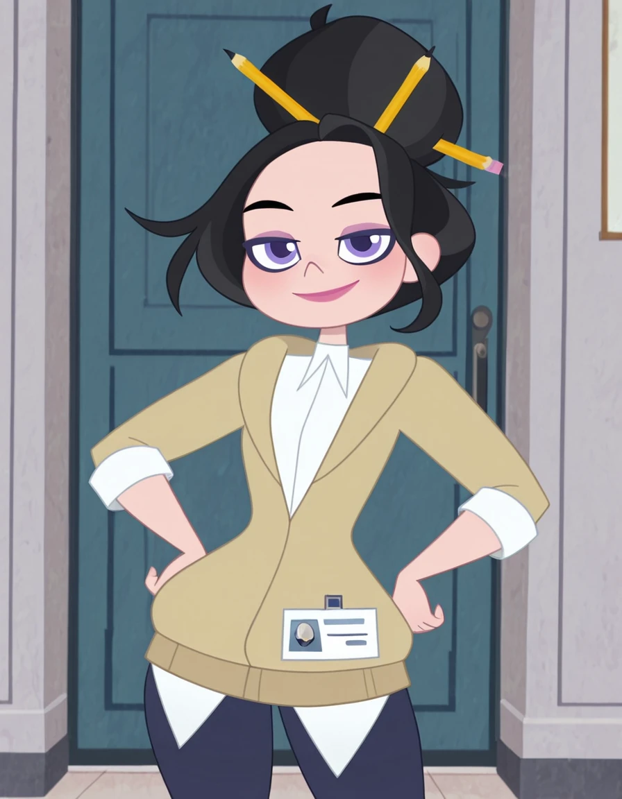 loislanedcshg, black hair, streaked hair, single hair bun, purple eyes, lipstick, pencils on hair, beige cardigan, white undershirt, medium sleeves, dark blue leggings, id card on hip, black flats