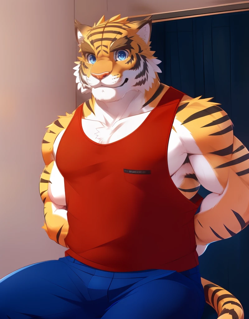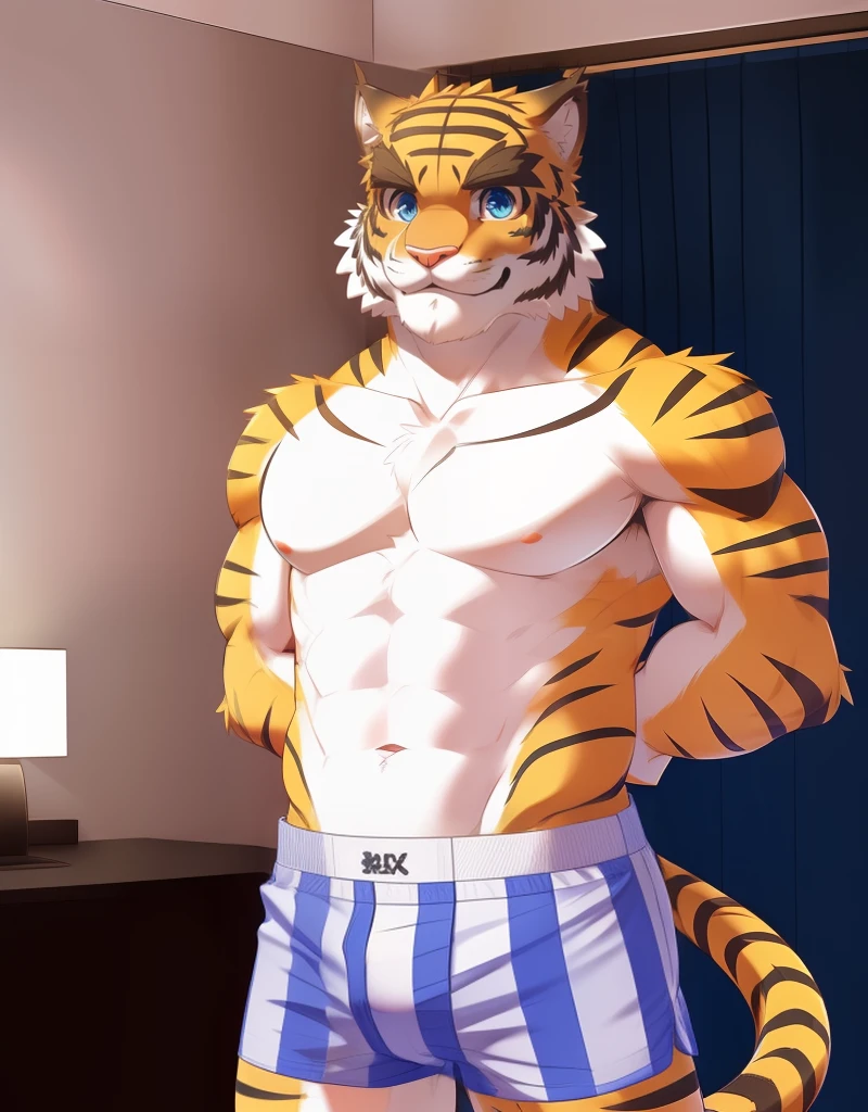 Related words : tiger stripes, white fur, yellow fur, two-tone fur, body fur, white hair, short hair, medium hair, facial hair, beard, blue eyes, thick eyebrows, tiger tail, tiger boy, tiger ears, animal ears, animal nose, snout, sleeveless, blue pants, belt, shoes, sneakers, ???????? under clothes, male swimwear