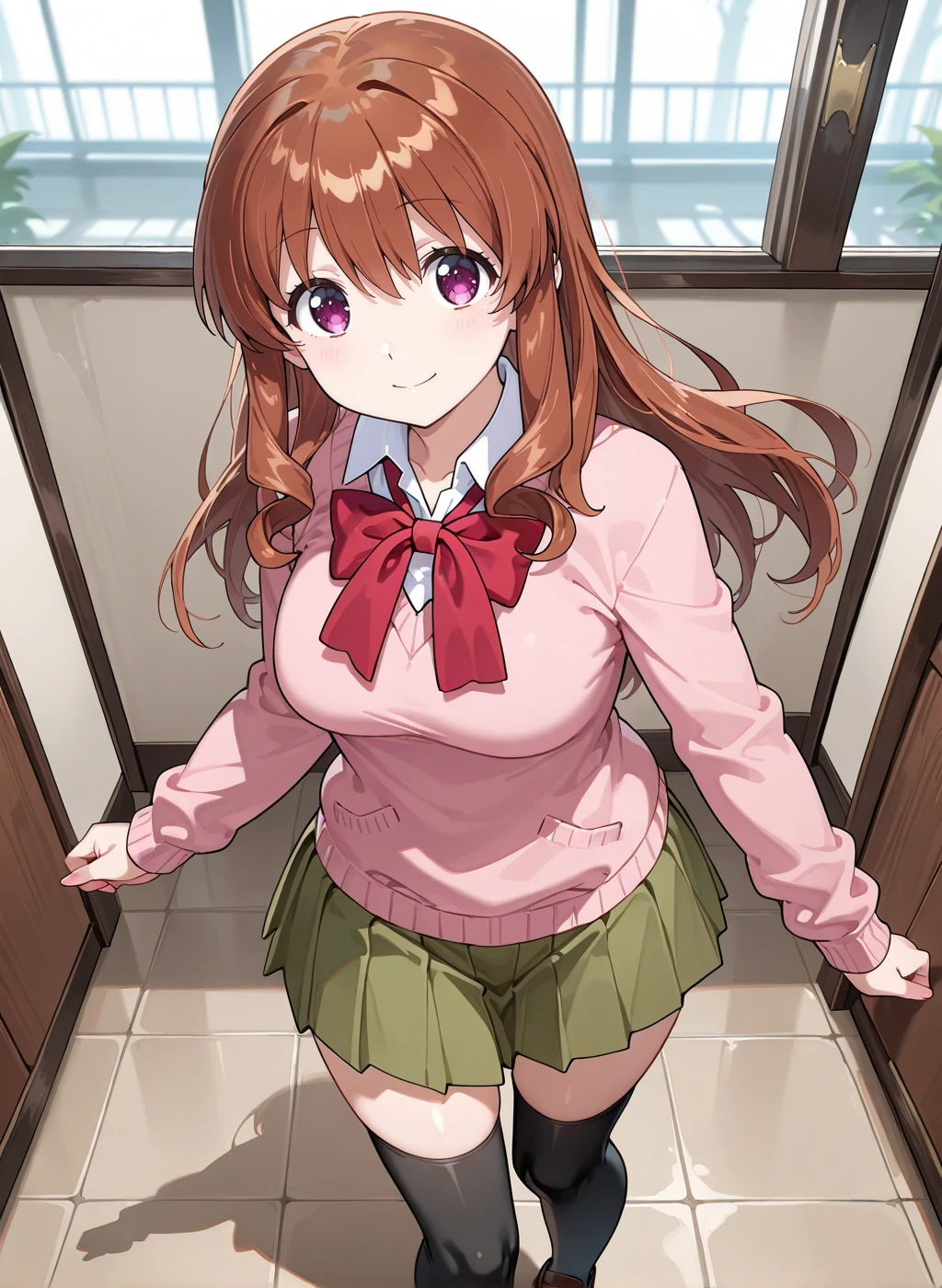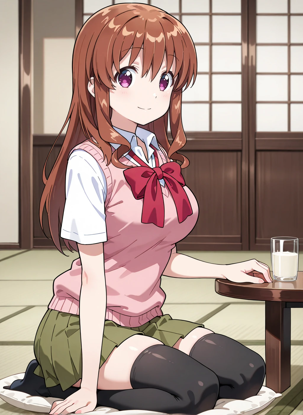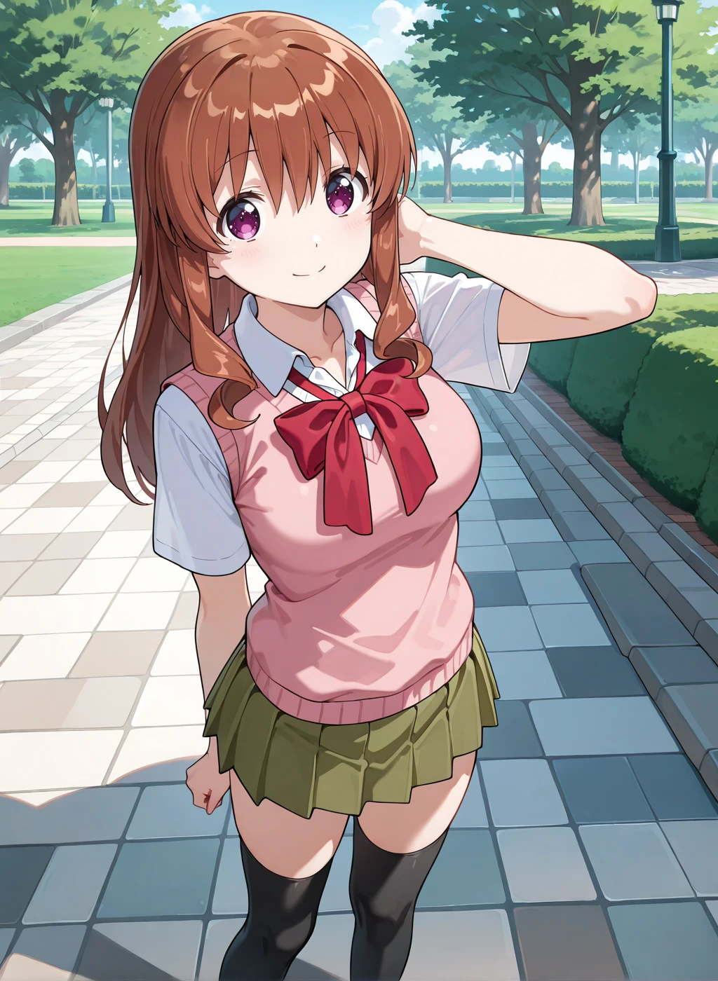 school uniform, short sleeves, black thighhighs, pleated skirt, bowtie, red bow, green skirt,sweater vestDescription