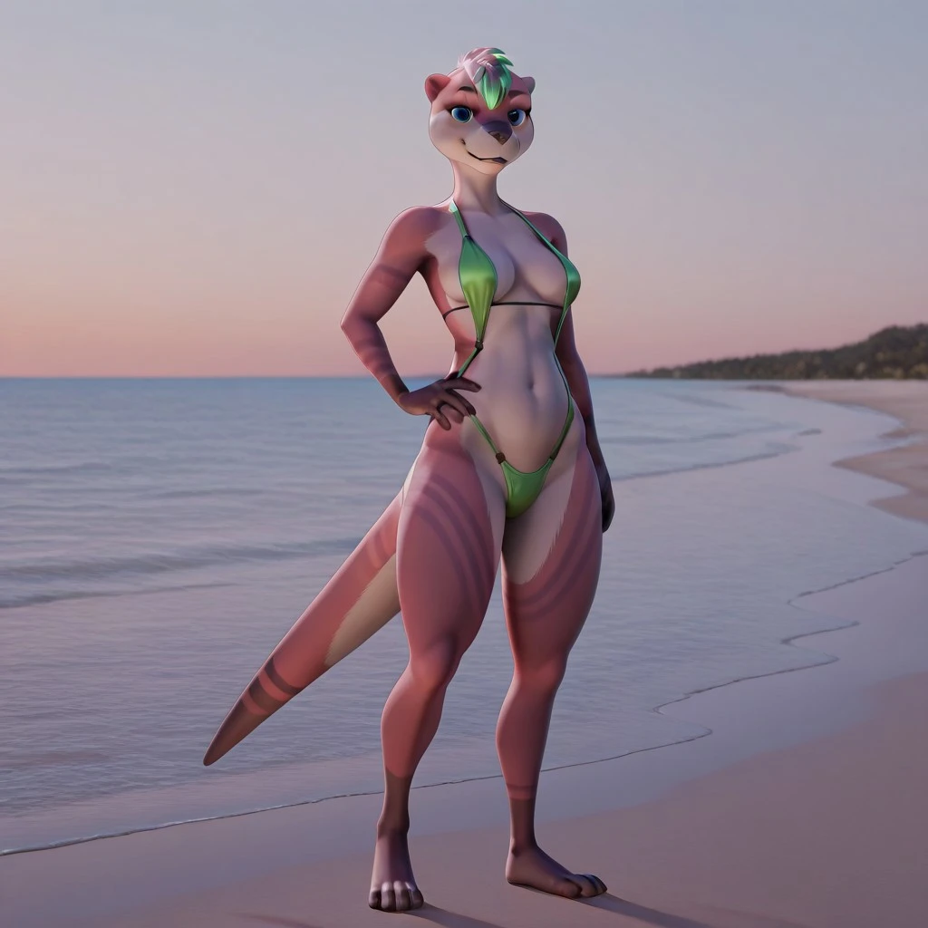river otter, otter girl, pink and white fur, blue eyes, brown nose, hair tuft, green highlights, otter ears, otter tail, medium breasts,