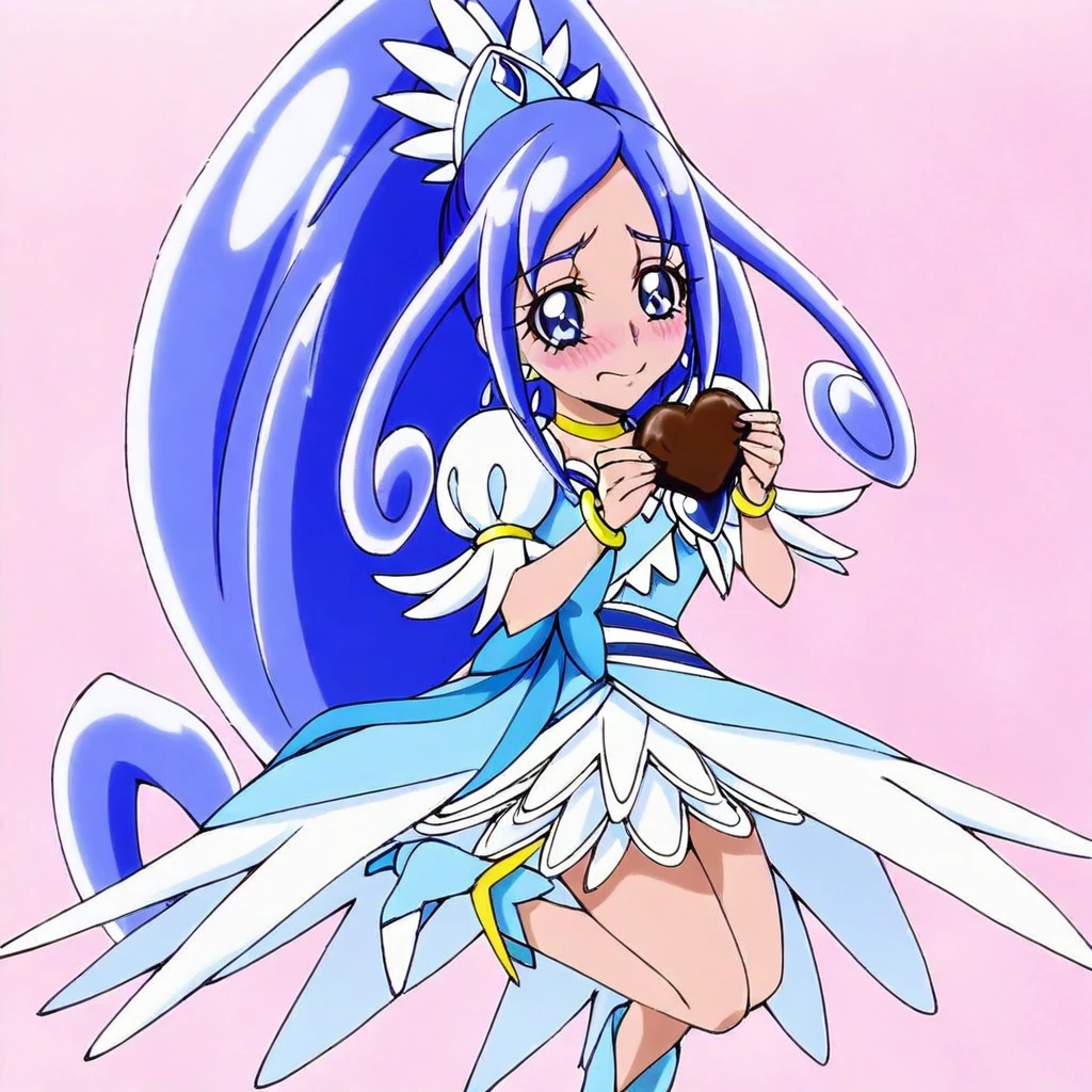 cure diamond \(precure\), blue hair, long hair, sidelocks, blue eyes, choker, jewelry, headdress, white and blue dress, magical girl outfit, bow, bracelets, skirt, heels, large breasts, 1girl, solo