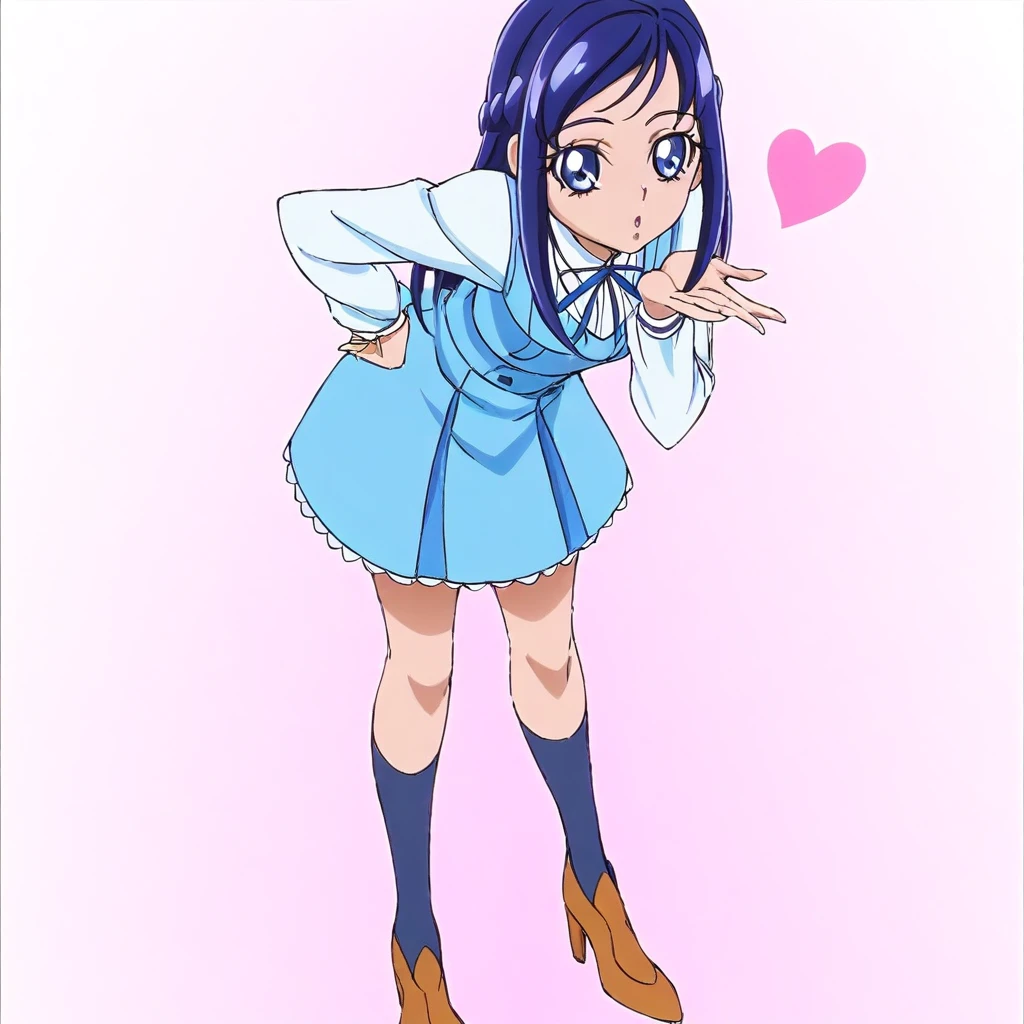 rikka hishikawa \(precure\), dark blue hair, long hair, braids, sidelocks, blue eyes, school uniform, skirt, ribbon, socks, heels, large breasts, 1girl, solo