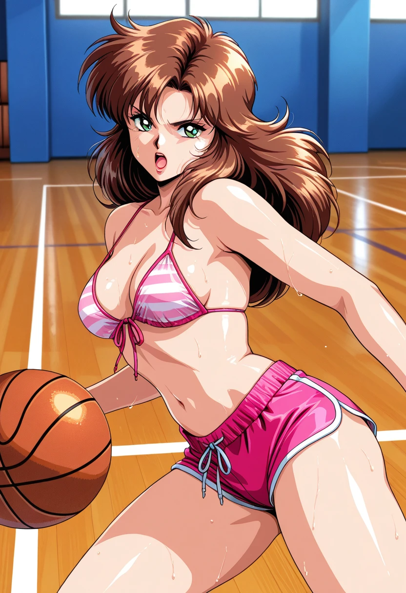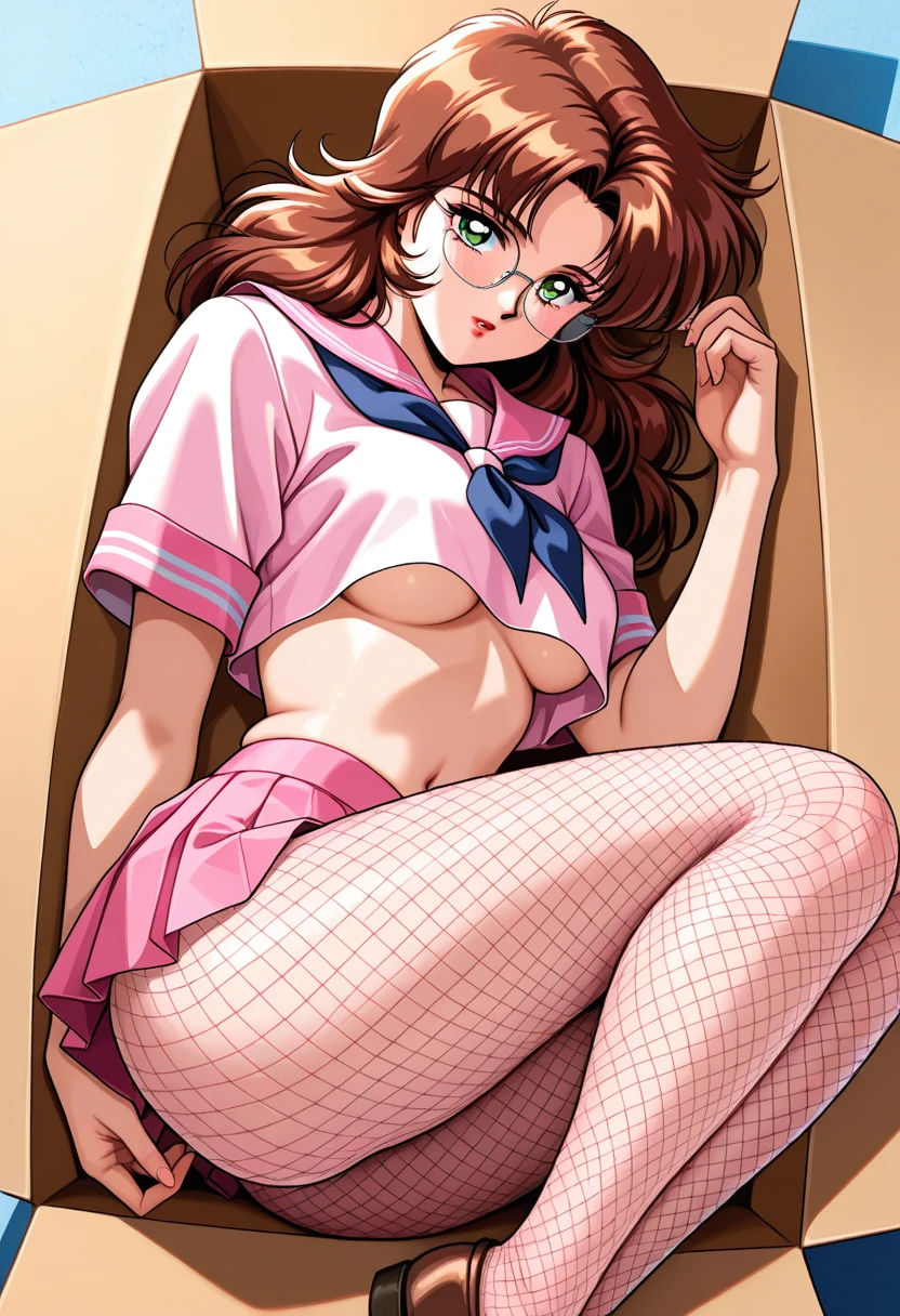 - yumiww, mature female, green eyes, brown hair, long hair, parted bangs, curtained hair, red lips, medium breasts,