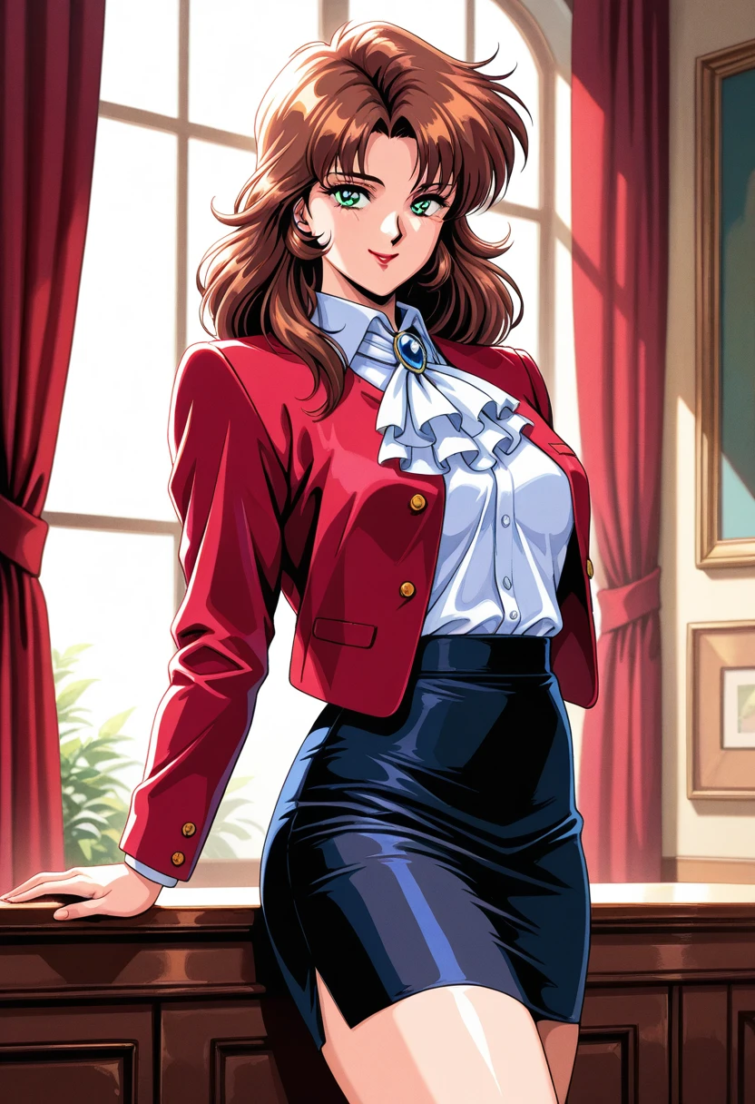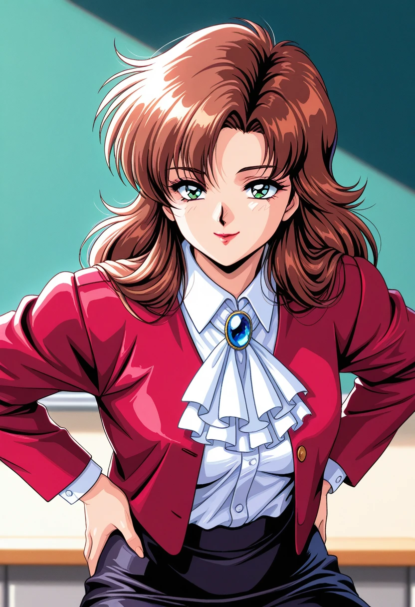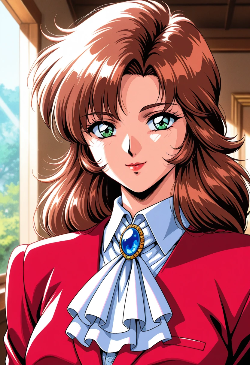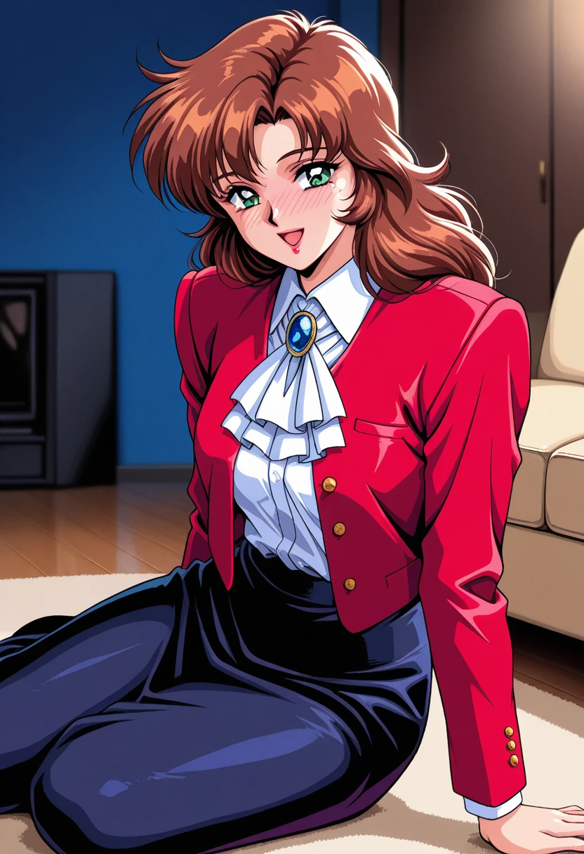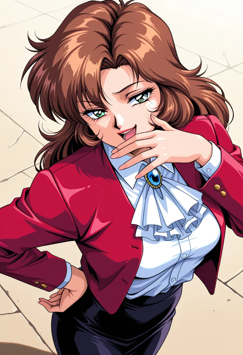 blazer, red jacket, , white ascot, blue gemstone, white shirt, dress shirt, long sleeves, shirt tucked in, black skirt,
